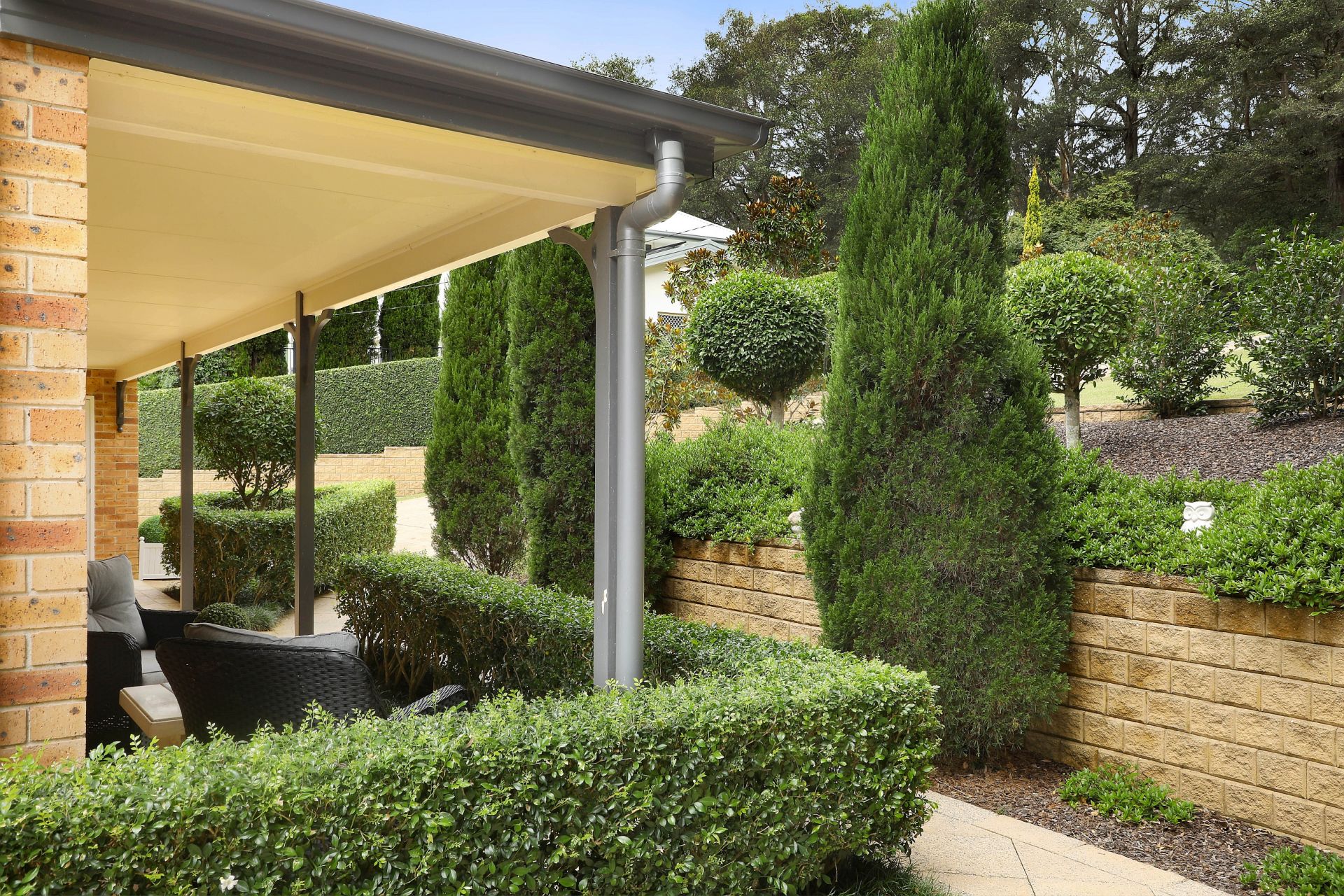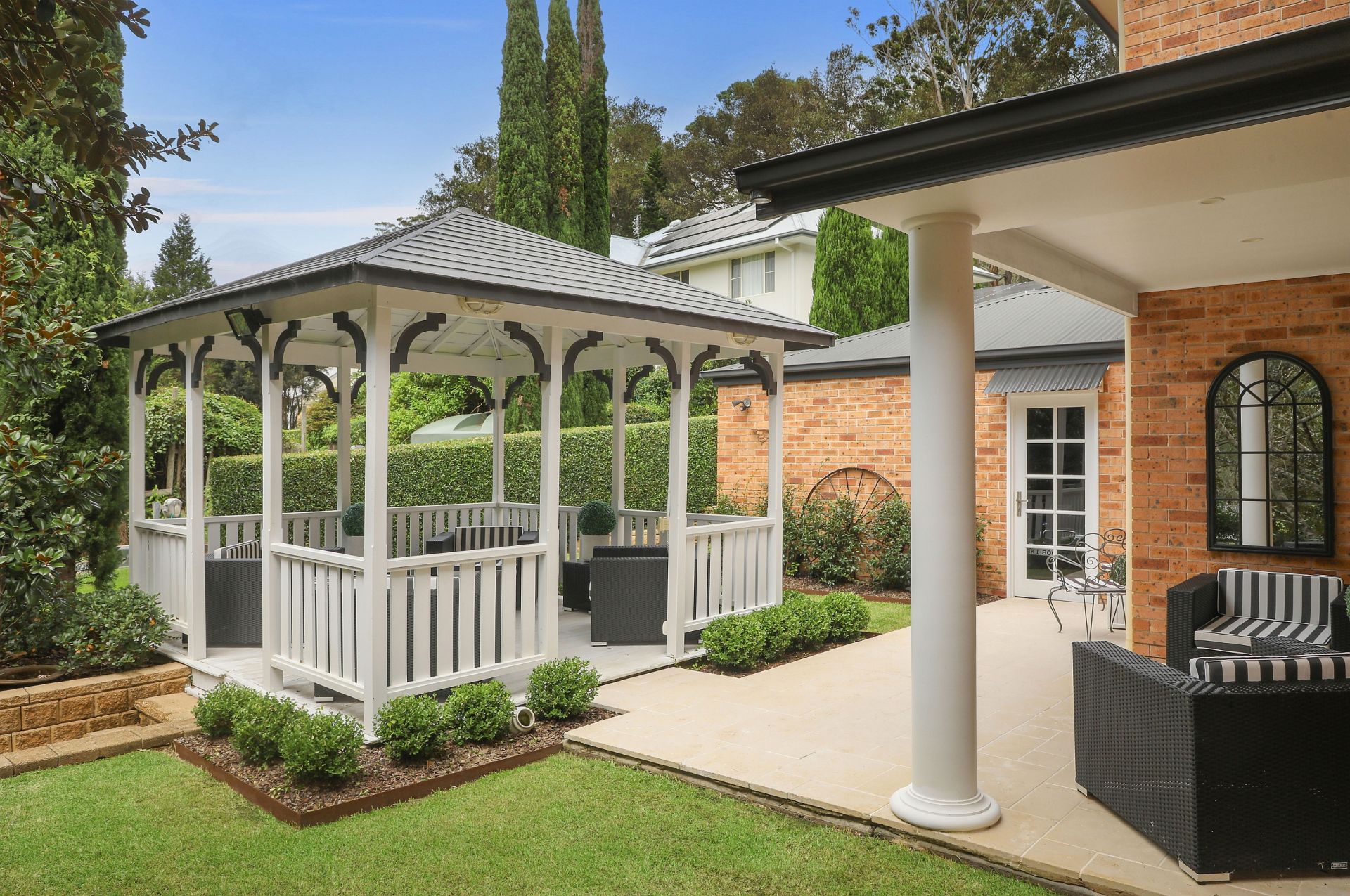 Designed for both relaxation and entertainment, this residence offers multiple living areas spread across two levels. The open-plan kitchen and dining area smoothly flow onto a paved courtyard, where a charming gazebo invites al fresco dining with a stunning garden backdrop.