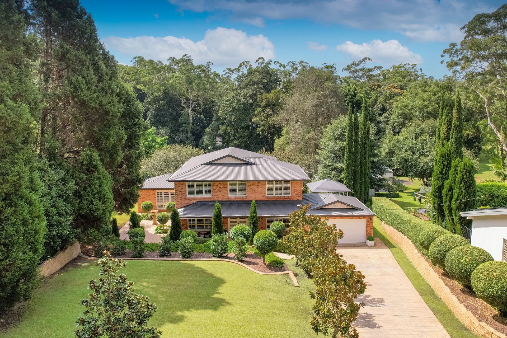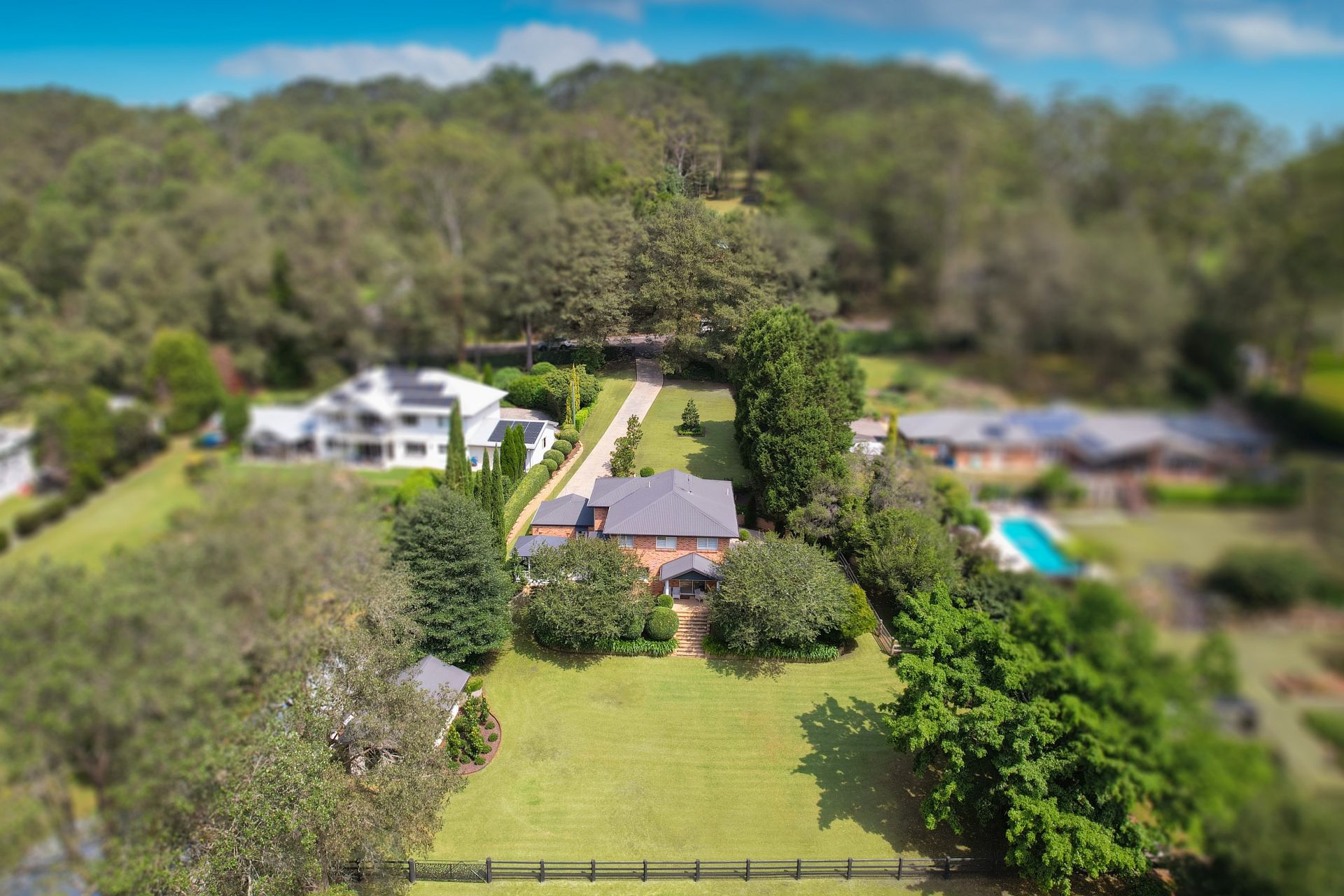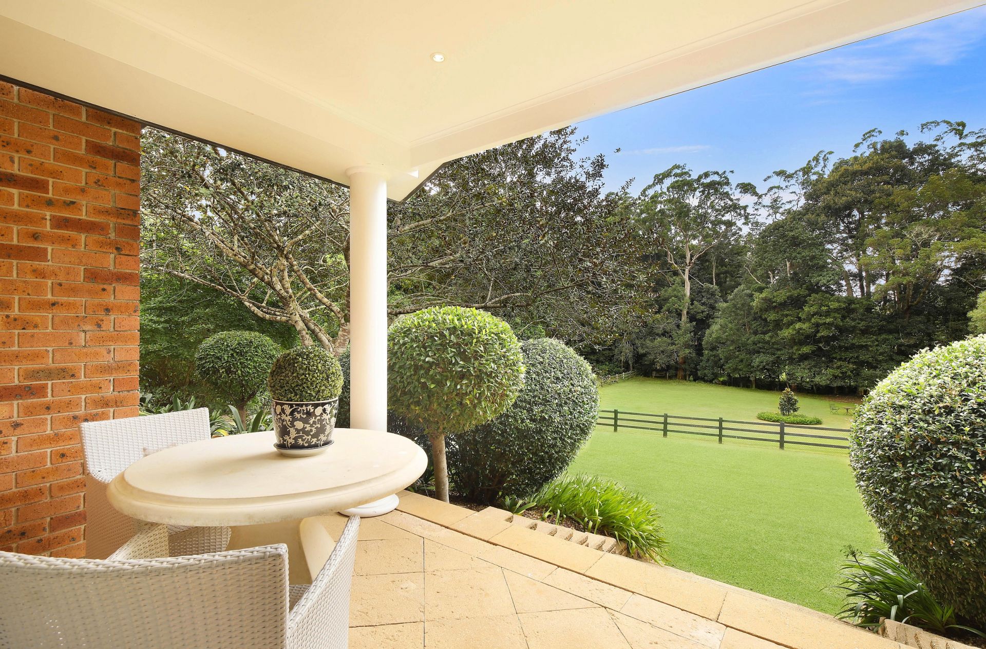 Set upon 2.5 sprawling acres of north-facing land, this sophisticated and meticulously maintained four-bedroom residence epitomizes the essence of turnkey living. Bathed in sunlight, the property has a serene and picturesque garden setting, where towering Magnolias, lush Ficus trees, and vibrant Camellias adorn the landscape, creating a tranquil oasis and ensuring unparalleled privacy. From the manicured lawns that stretch to the rear of the property, one can revel in the beauty of the surrounding nature.
