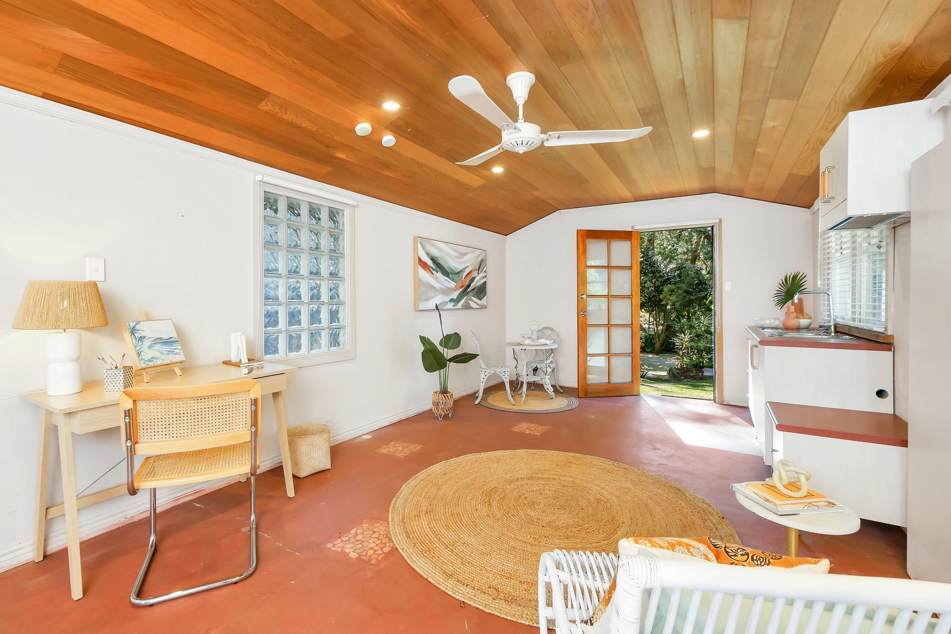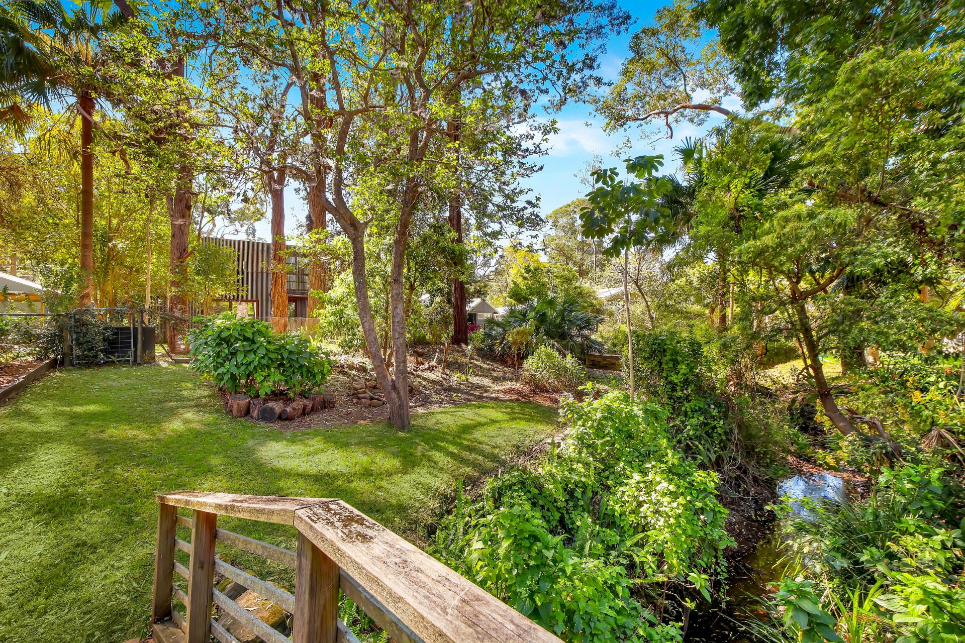 The home features three bedrooms, including a master suite with an ensuite, and a modern kitchen equipped with ample storage, a dishwasher, and skylights. The open-plan living area is enhanced by bi-fold doors that lead out to the outdoor entertaining space. The versatile garage is currently utilised as a studio, offering additional flexibility. Outdoors, you'll find an inviting fire pit area and a charming bridge over a creek, leading to additional space perfect for relaxation or entertaining. Additional features include under-house storage, a separate shower, split system air conditioning, and beautiful timber floors throughout.