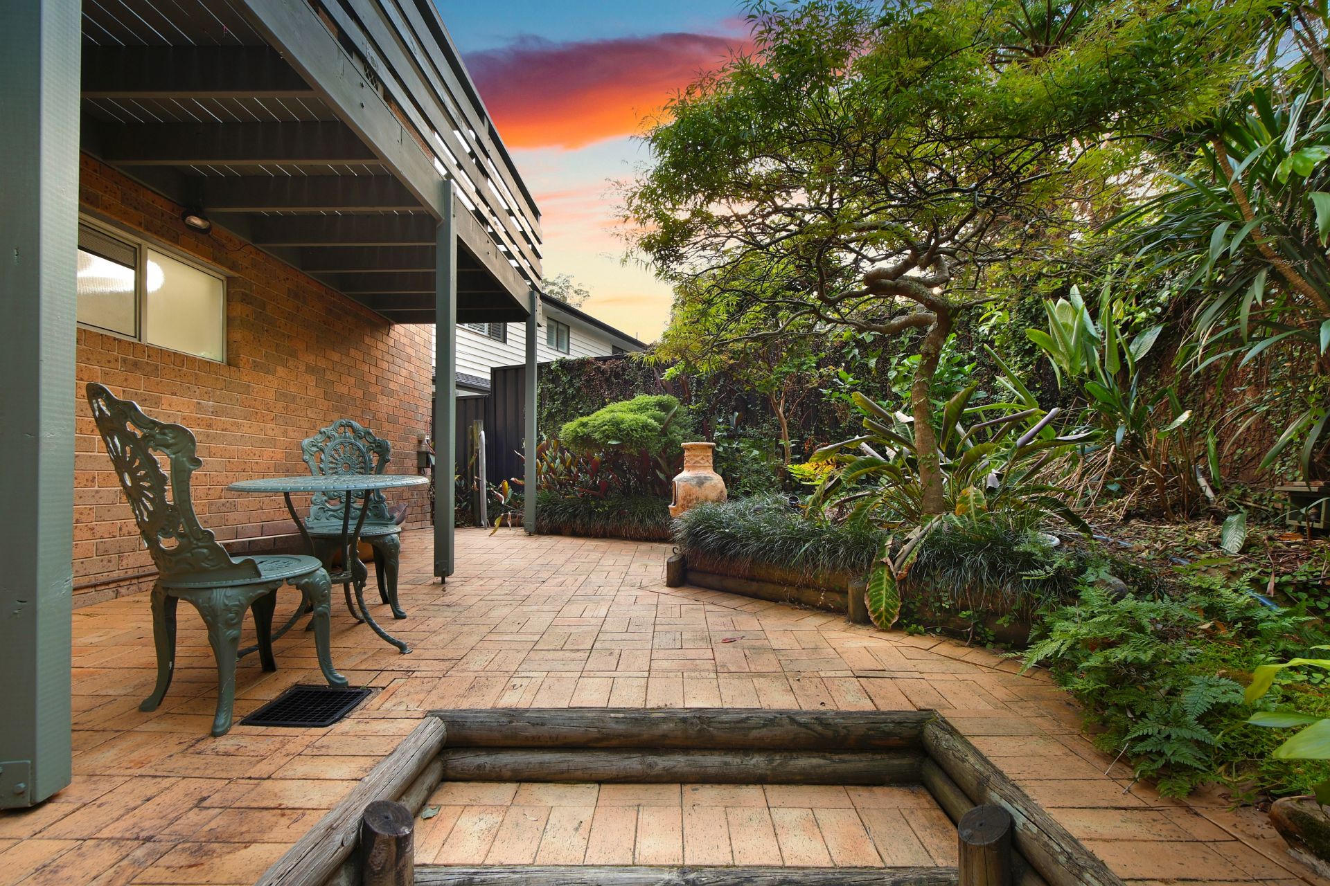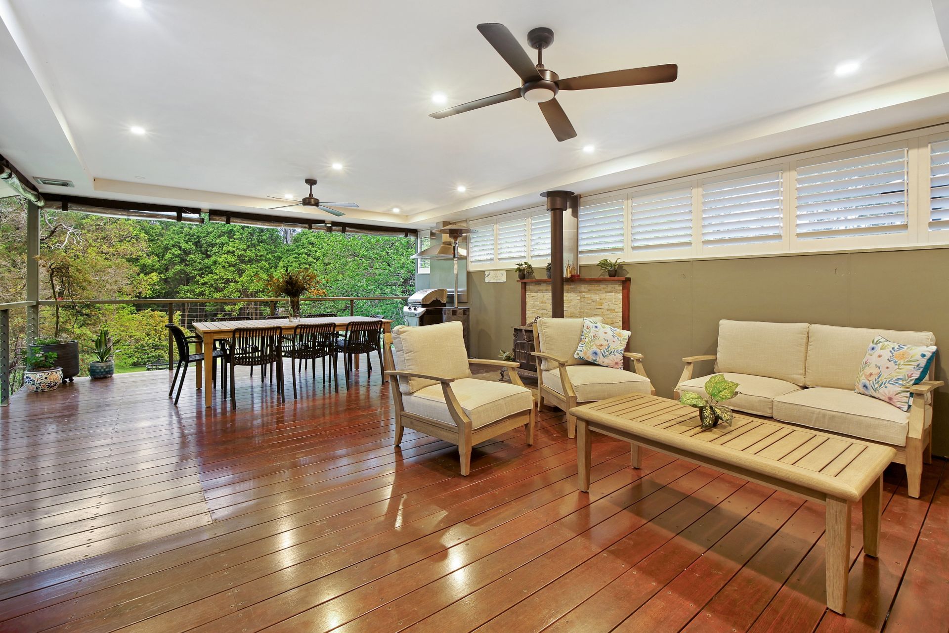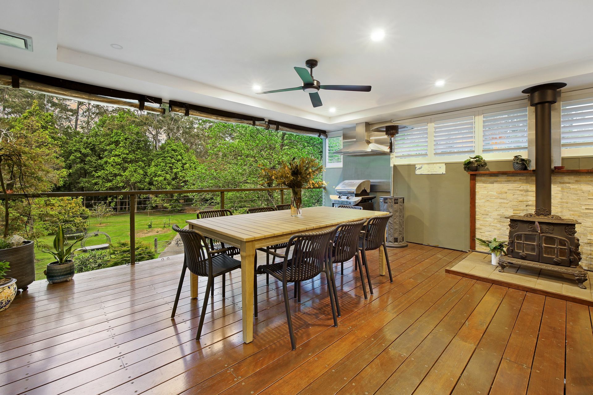 The 8m x 6m covered entertaining area has Silver Top Ash Hardwood timber decking and its very own log fire, making it the perfect place from which to enjoy the tranquil surrounds. There is seamless integration between indoor and outdoor living, and with full weather blinds and the potential for an outdoor kitchen, this space can be enjoyed year round!