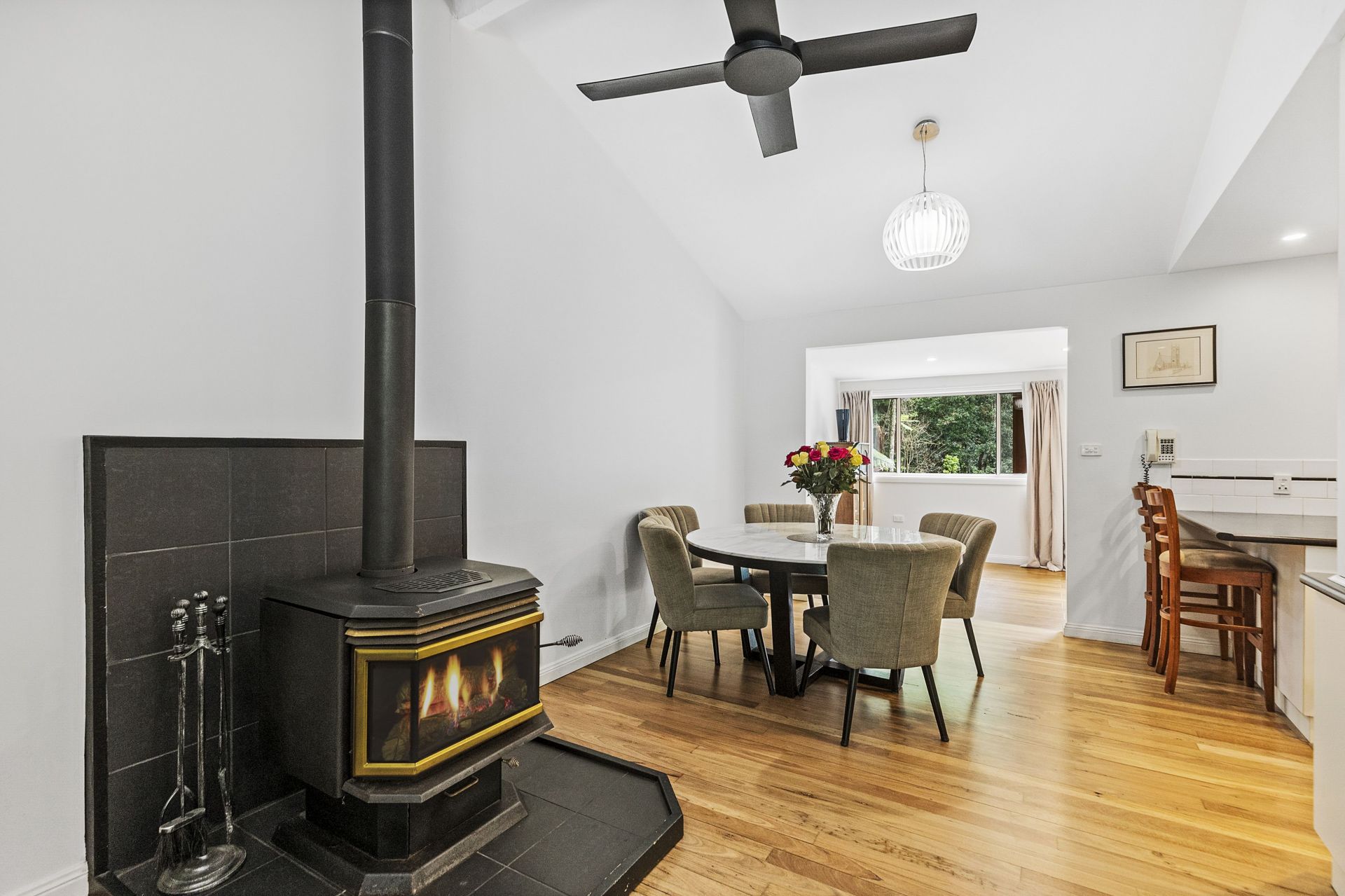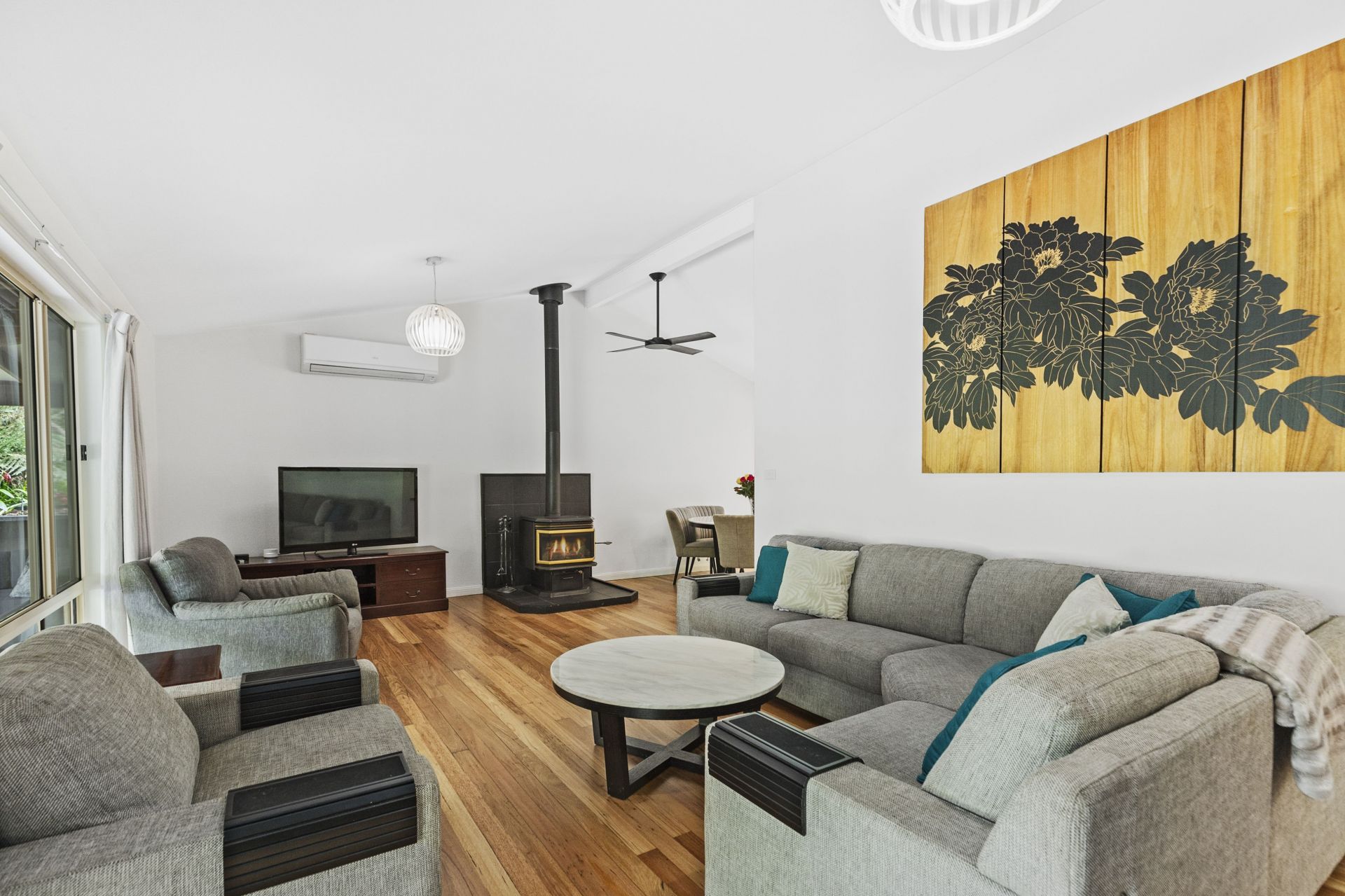 The alfresco entertaining area provides ample space for outdoor dining and entertaining, surrounded by the beauty of nature. Practicality is ensured with four carport spaces, offering plenty of room for vehicles, boats, or trailers. The property also features a wood fire heater for cozy winter nights, air conditioning for year-round comfort, and beautifully landscaped gardens with dedicated spaces for growing your own produce.