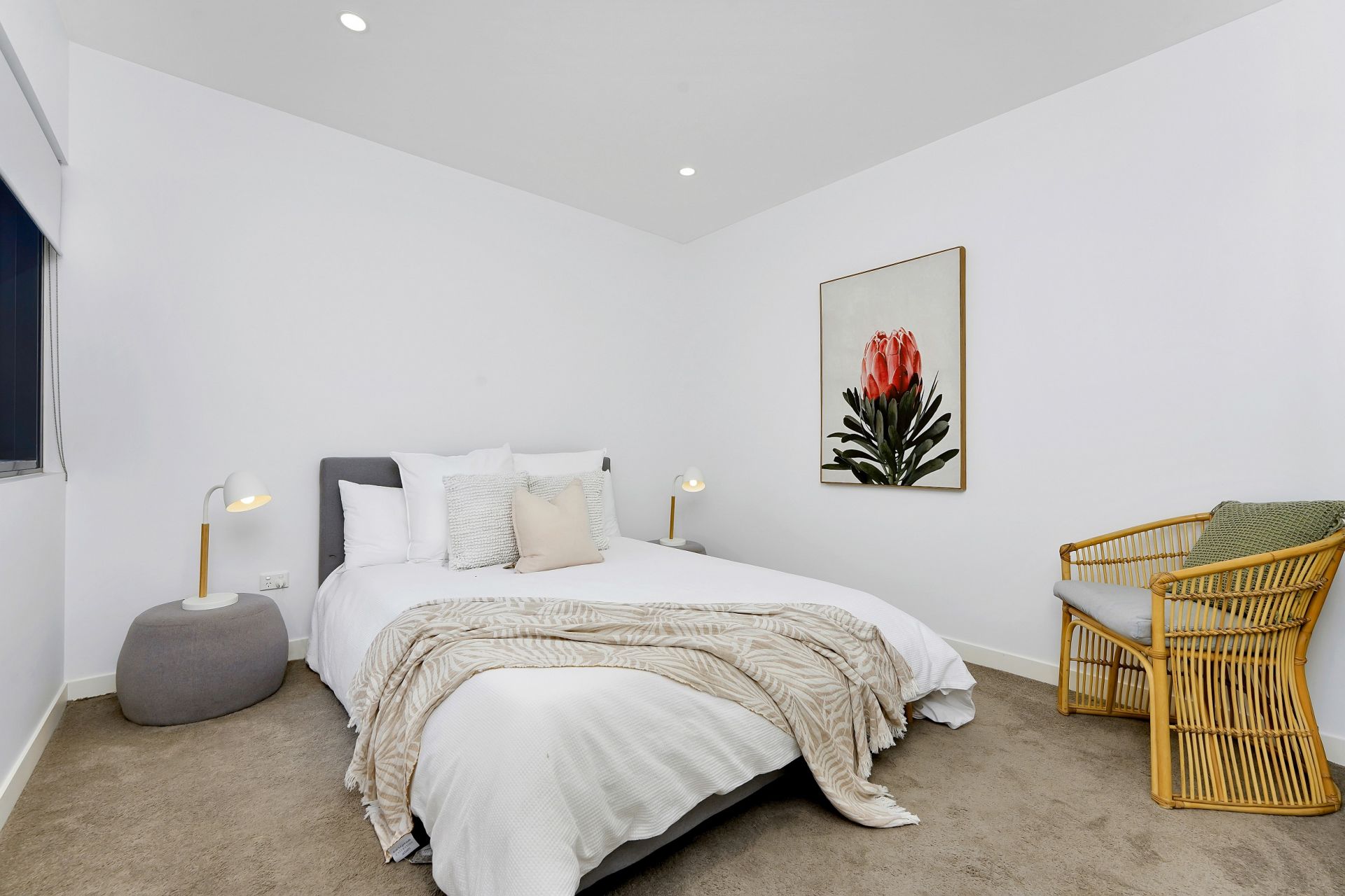 This apartment is located on Level 5 and has an open plan kitchen, dining and living space that flows out to the private balcony through glass sliding doors. The main bedroom has access to this balcony, along with a built-in robe and stylish ensuite. Both bedrooms are carpeted, and the second also has a built-in robe.