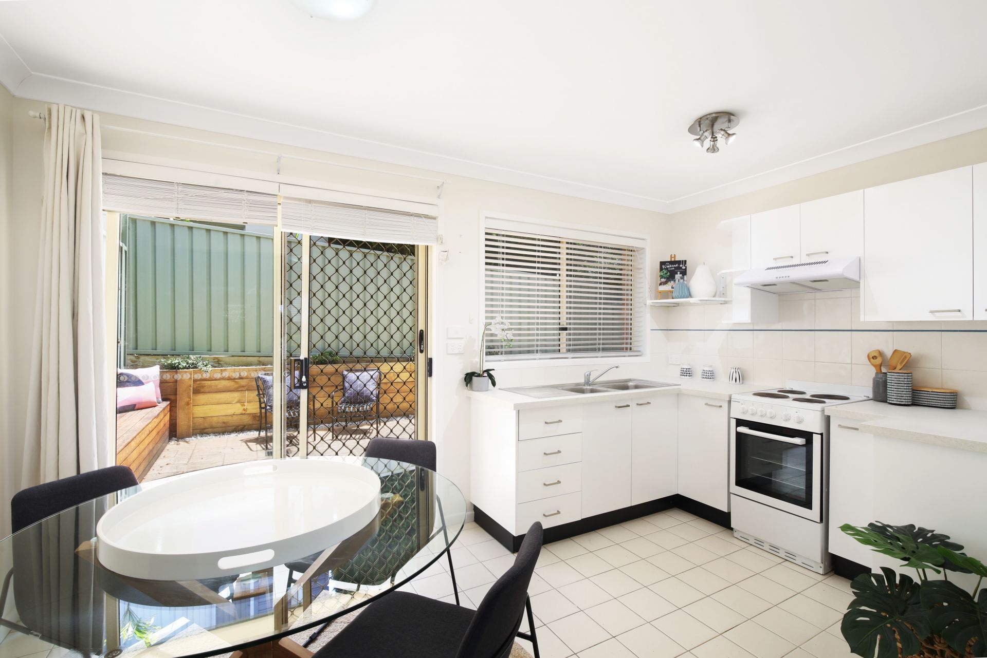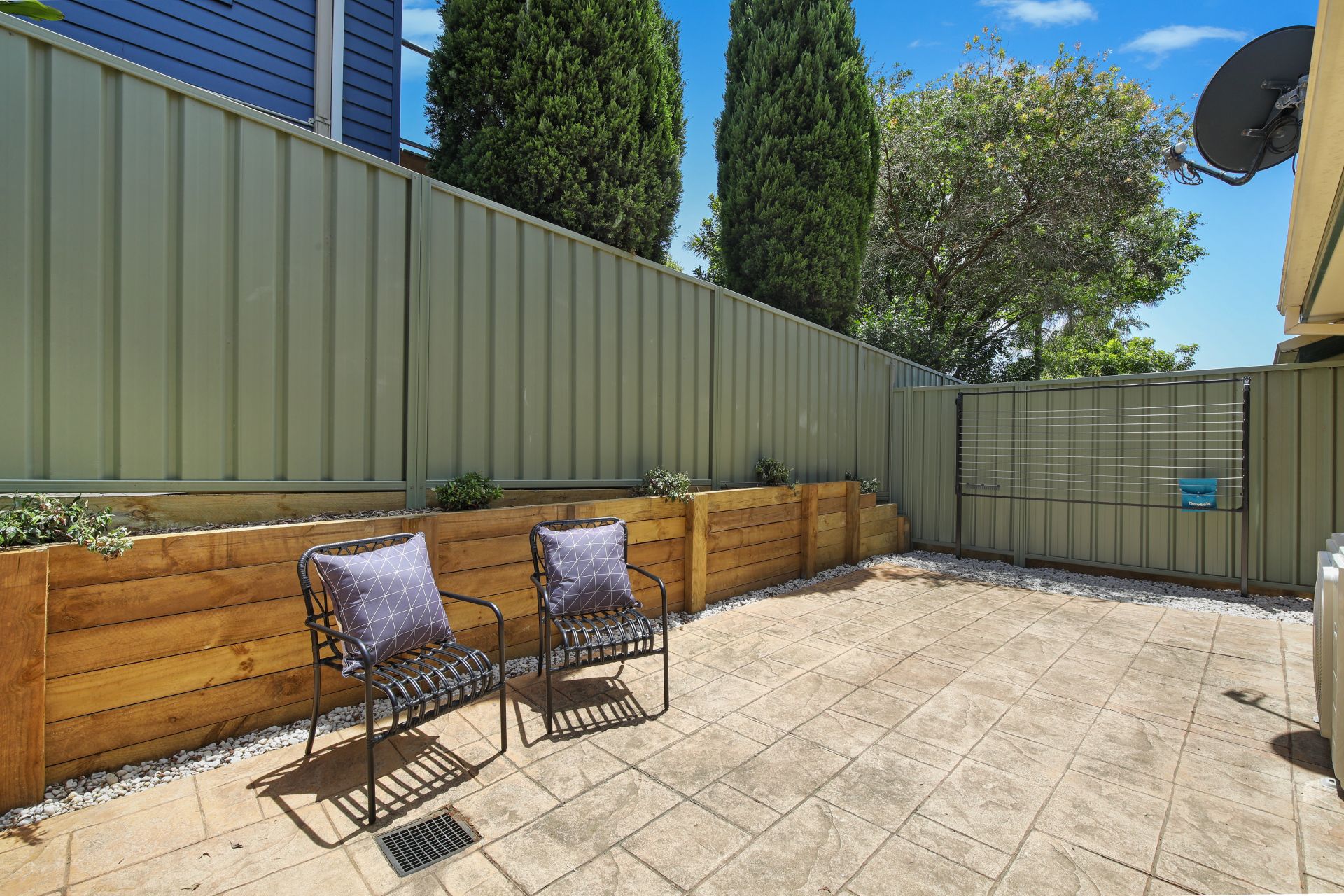 The spacious living area leads to the tiled kitchen and dining area. The paved, sunny, rear courtyard has a built-in bench seat, a fold-down mounted clothesline and plenty of room for an outdoor setting, providing a place to relax and enjoy the peaceful surrounds.