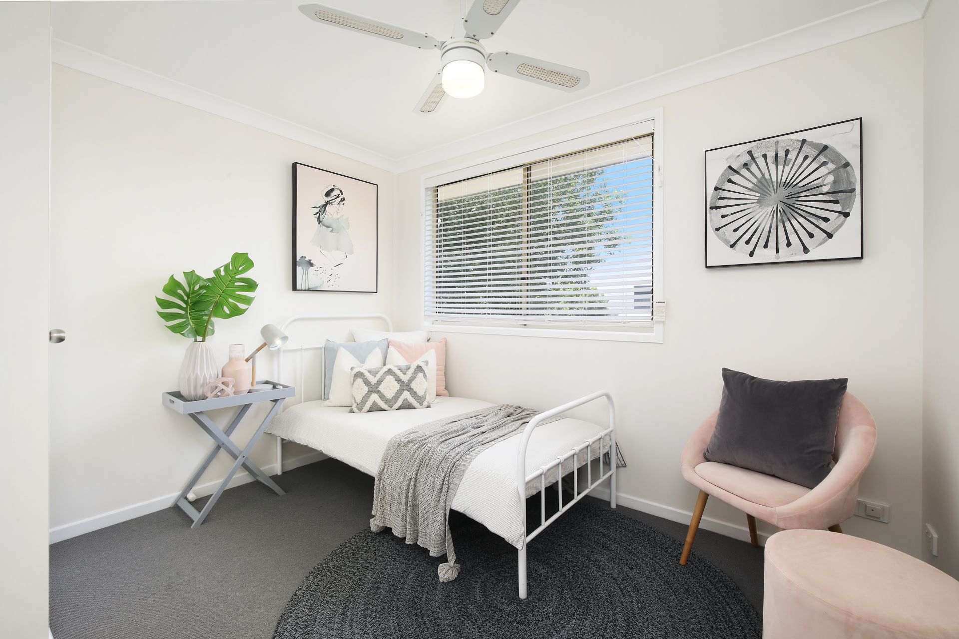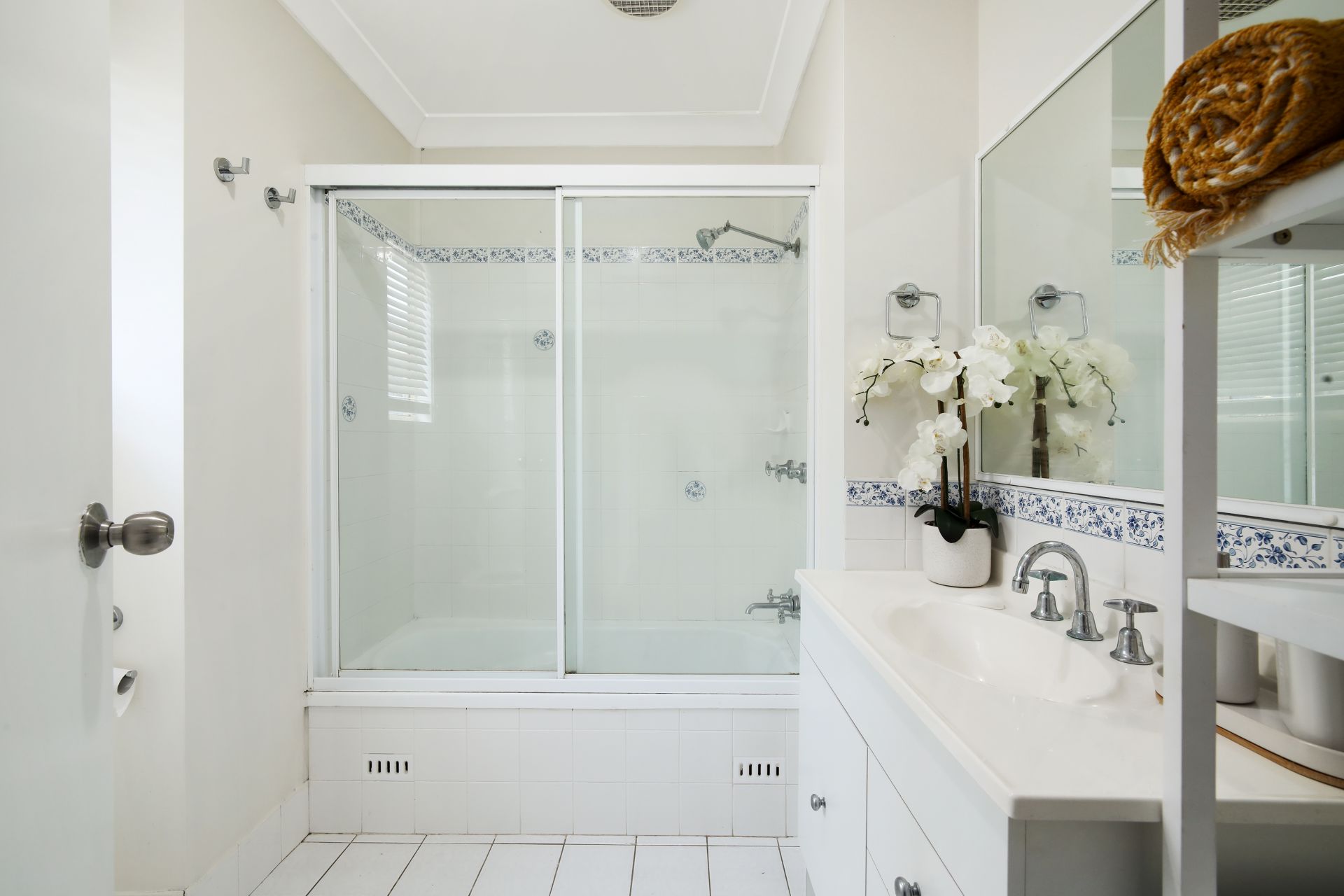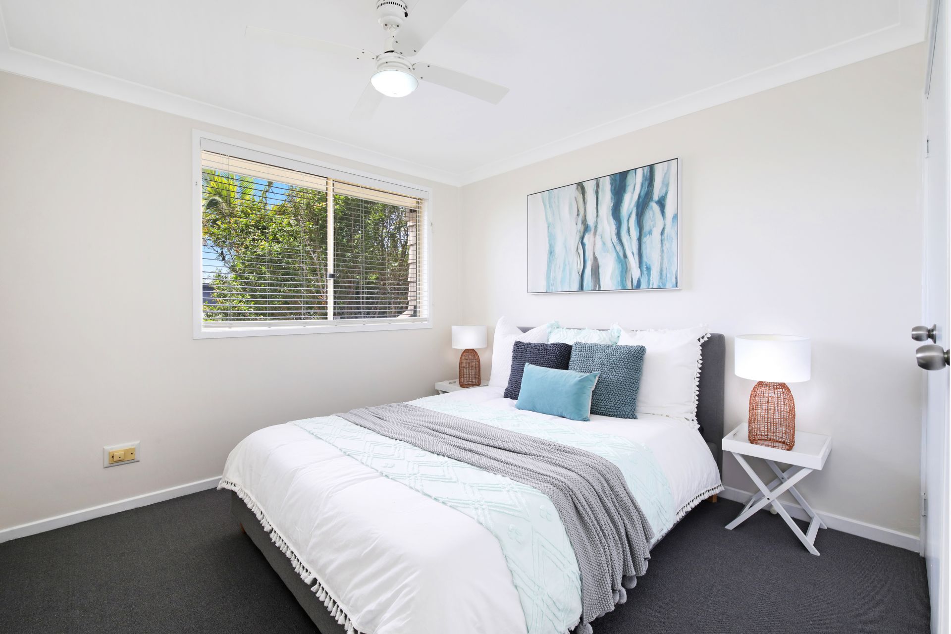 The two bedrooms and the bathroom are on the upper level. Both bedrooms have a ceiling fan and built-in robe, and the bathroom has a shower over the bath.