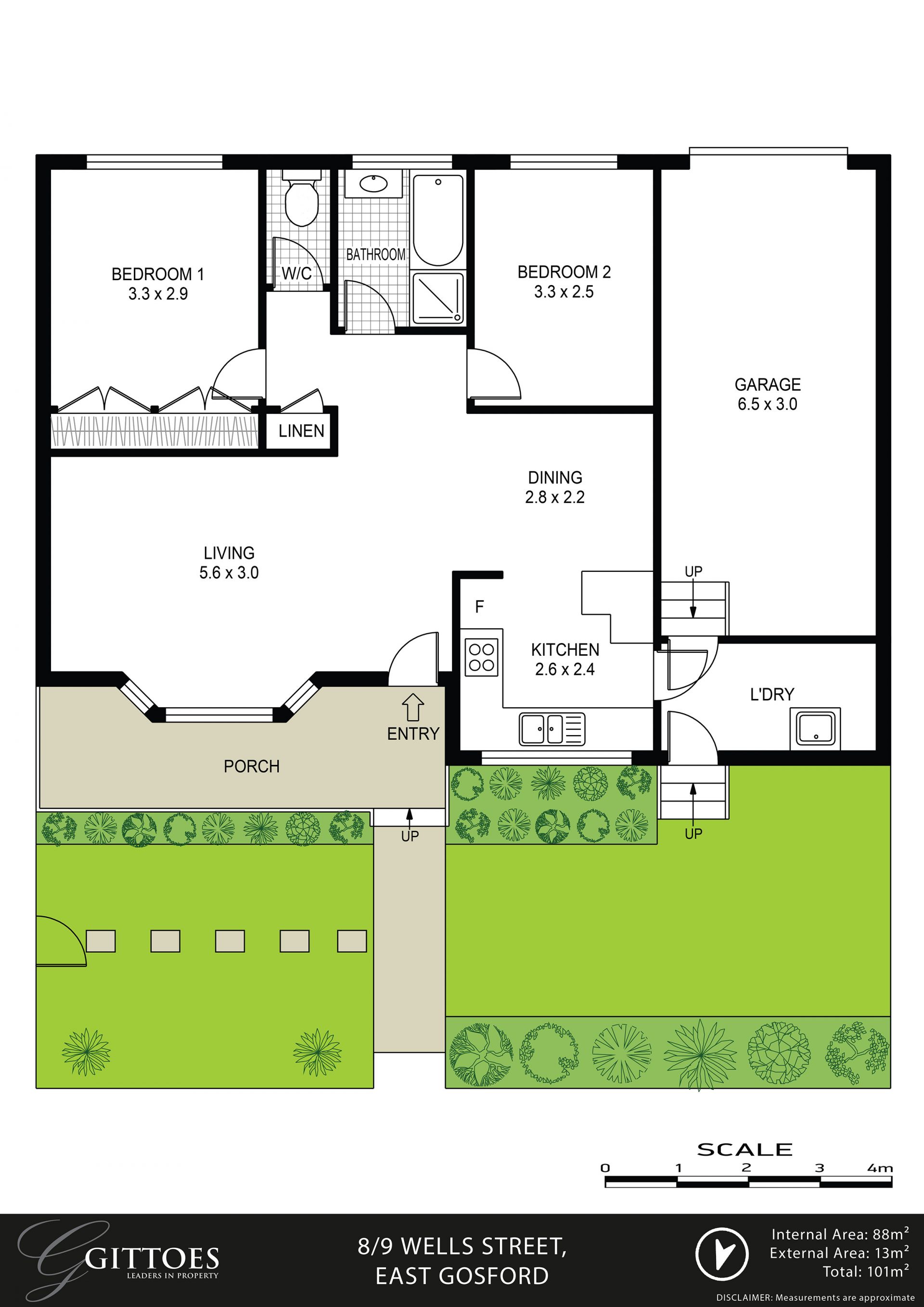 The home is immaculately presented with fresh paint and new flooring throughout, a recently renovated kitchen with stainless steel appliances and great storage, original bathroom with separate bath tub, reverse cycle air-conditioning, an open-plan sunny living area which leads out to a secure north/west-facing grassed courtyard and established landscaped gardens. There is internal access to the single lock-up garage and the laundry.