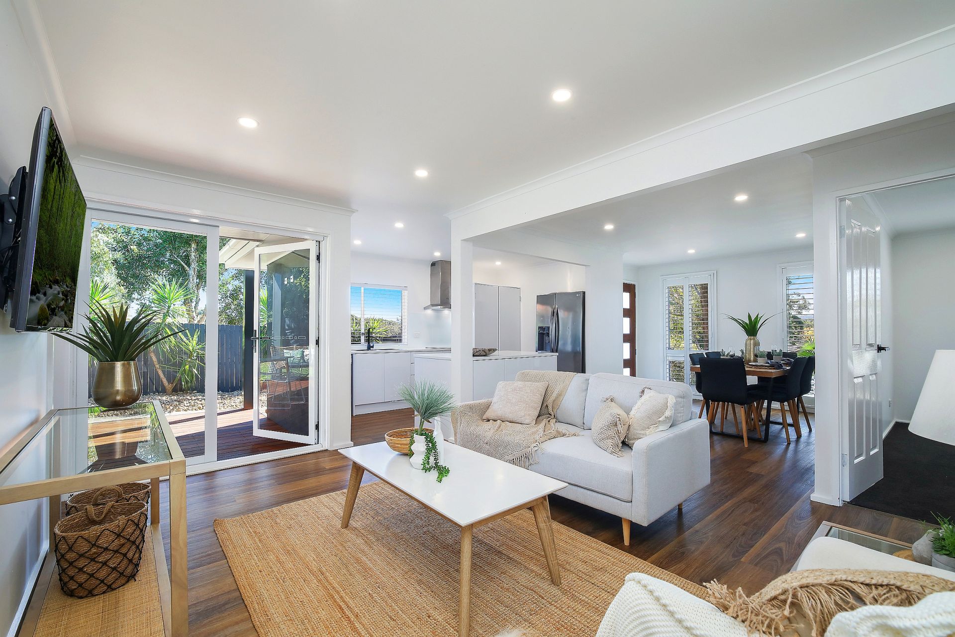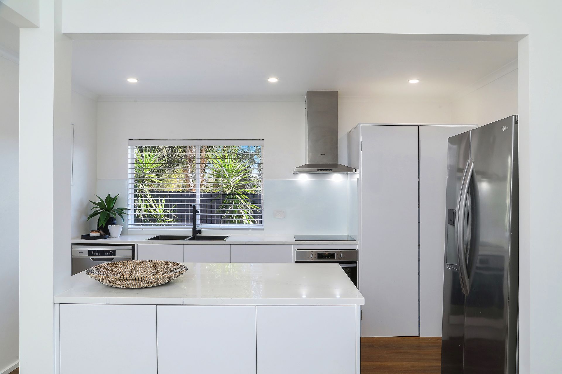 The spacious open plan dining, living and kitchen area has downlights, timber flooring and large glass doors opening onto the adjoining covered deck. The kitchen is stylish with stainless steel appliances, an electric cooktop and matte black tapware, and it also incorporates a European style laundry.