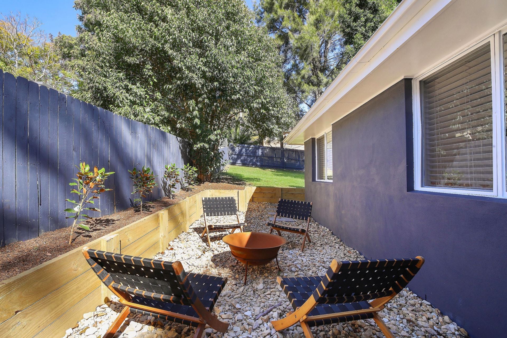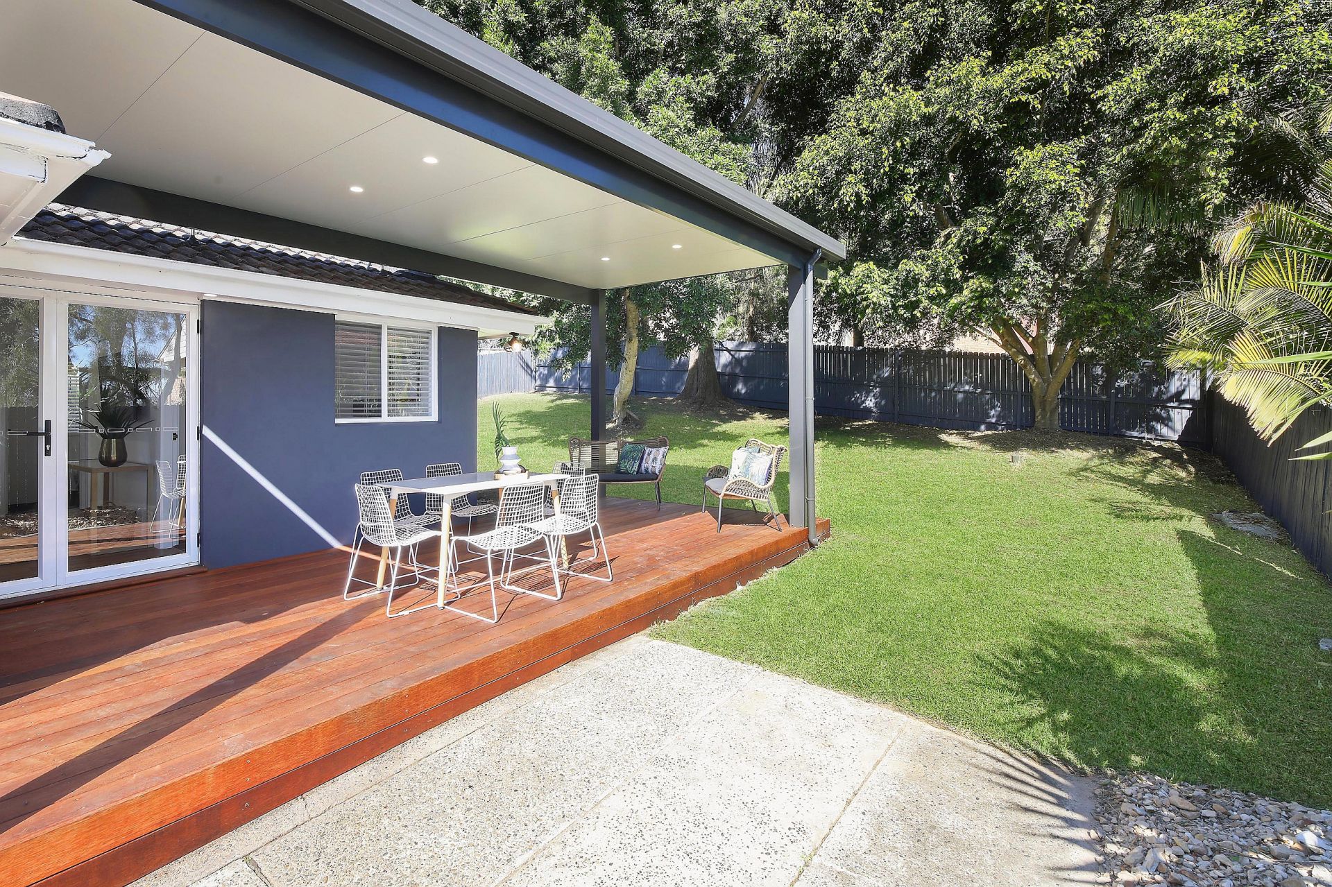 The covered deck leads to the grassed rear yard, there is another private sitting area to the side of the home and level parking for one car.