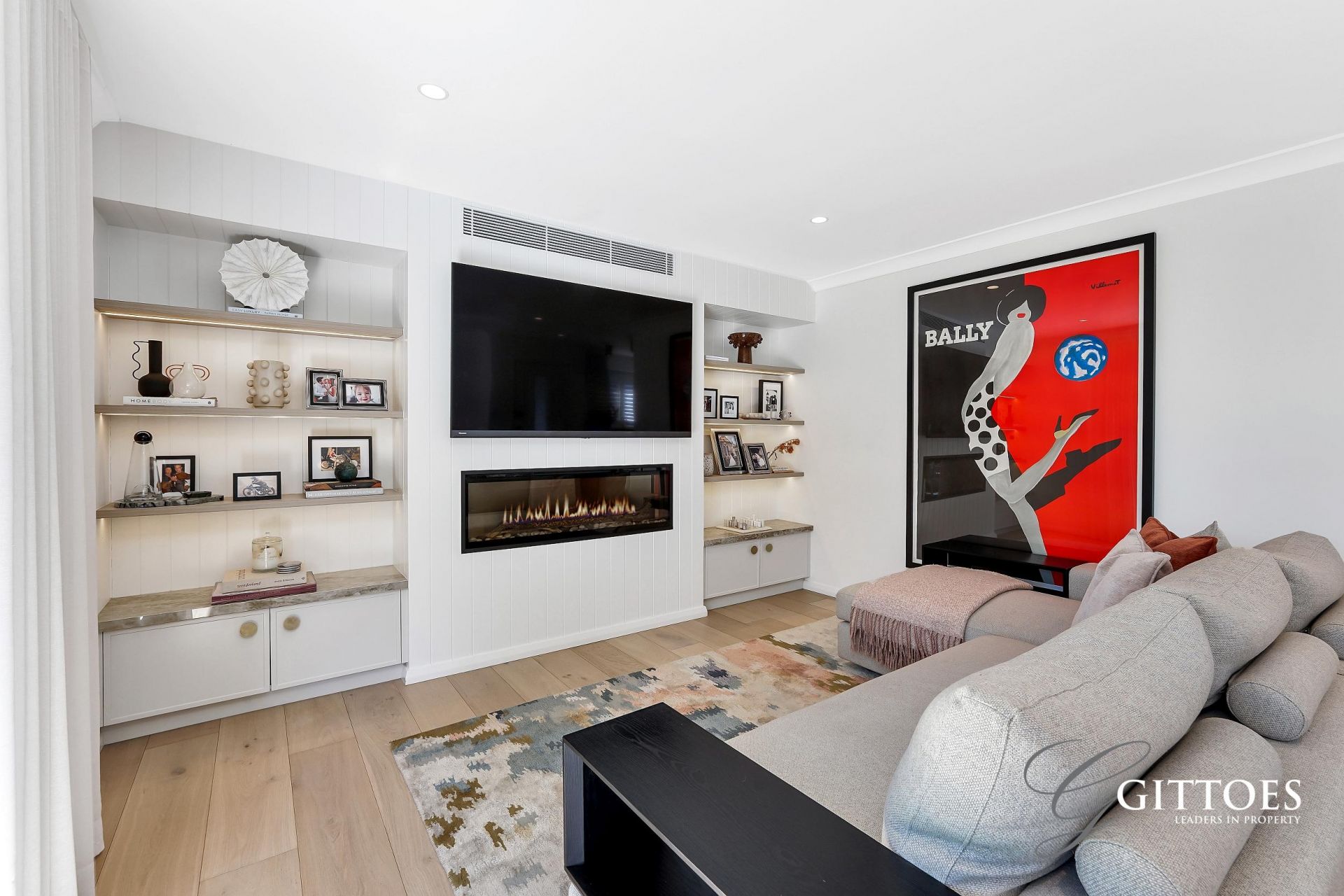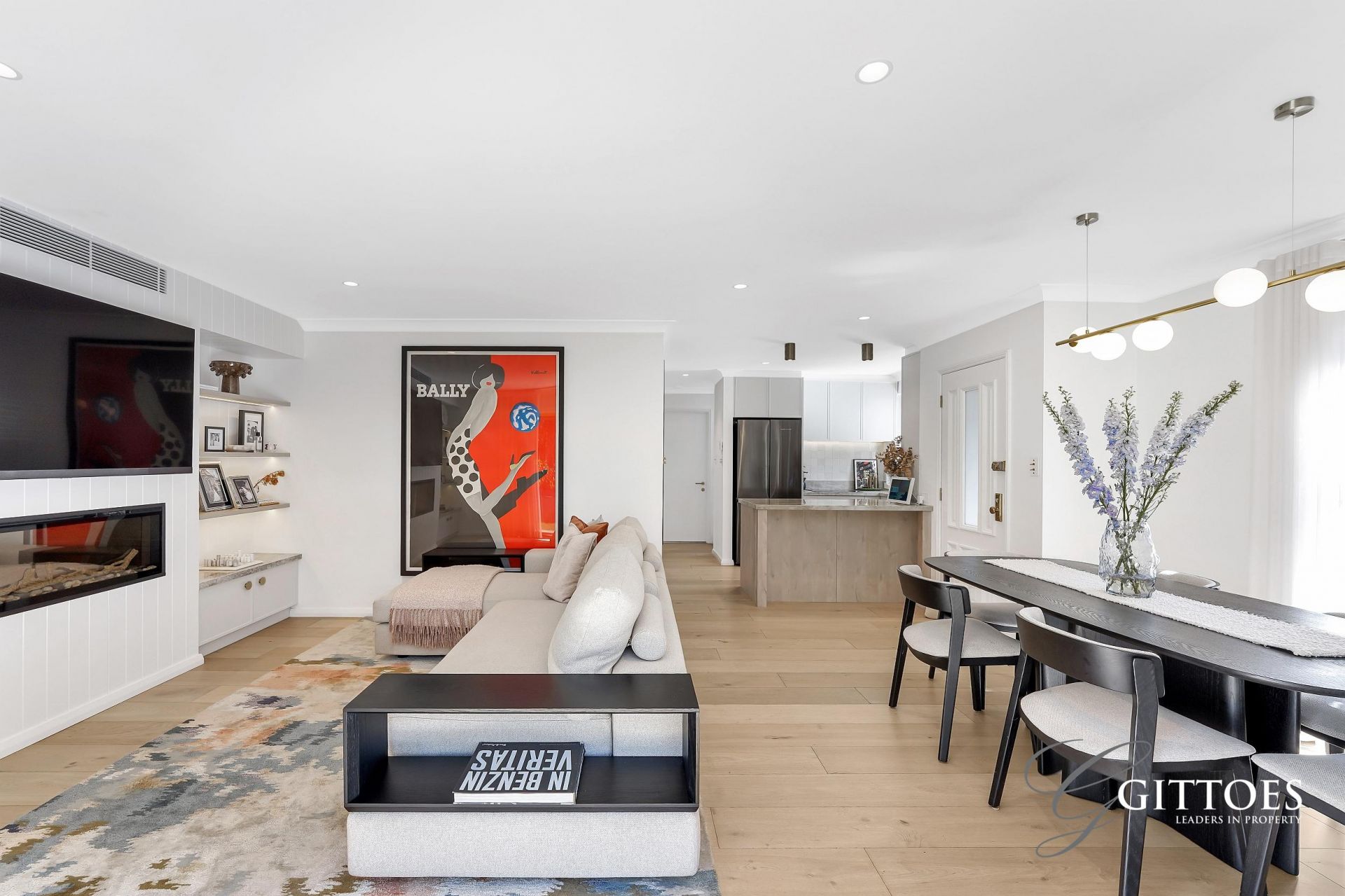 Inside, the quality is immediate. Plantation shutters, s-fold luxury curtains, engineered oak flooring and imported Italian tiles set an elegant foundation, complemented by brass fixtures and a contemporary electric fireplace that adds warmth and sophistication.