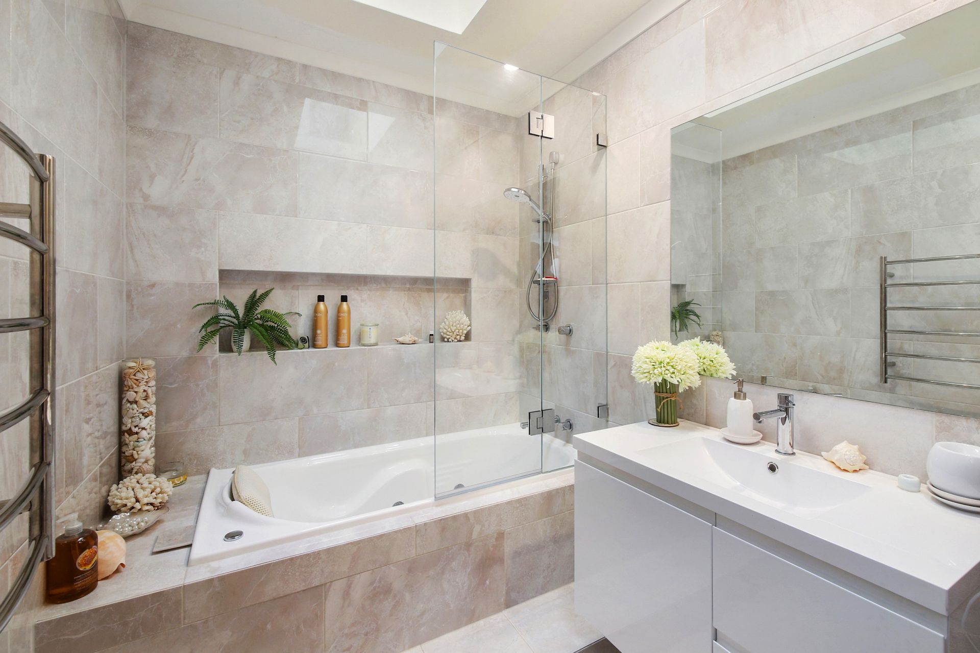 Both bathrooms are finished in a resort-inspired style with floor-to-ceiling marble-look tiling, with the main bathroom offering a step-up bathtub. The main bedroom includes a walk-in wardrobe, while the additional bedrooms are fitted with built-in robes.