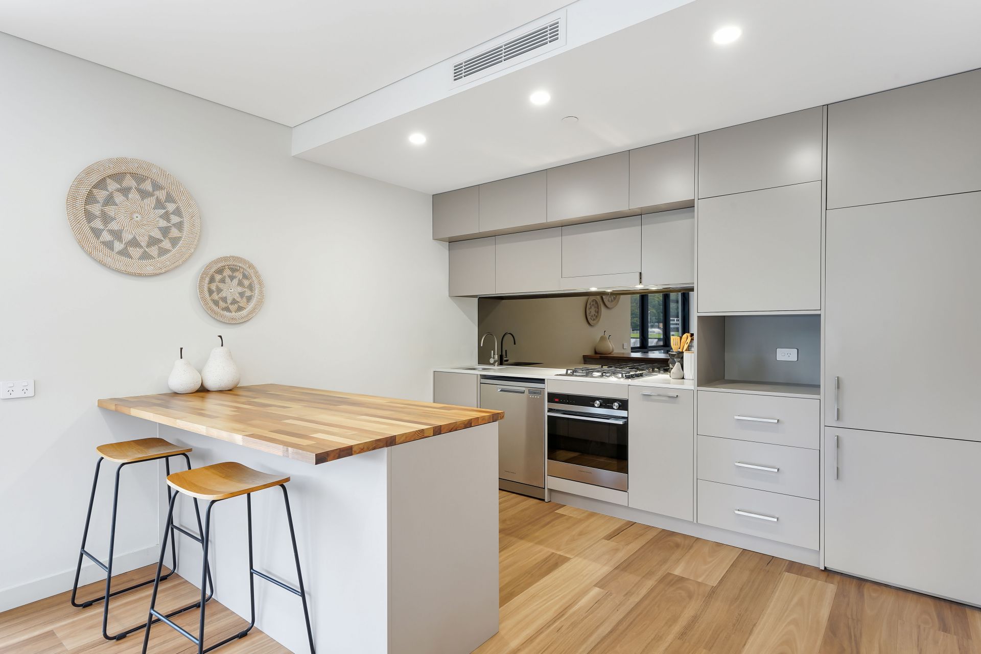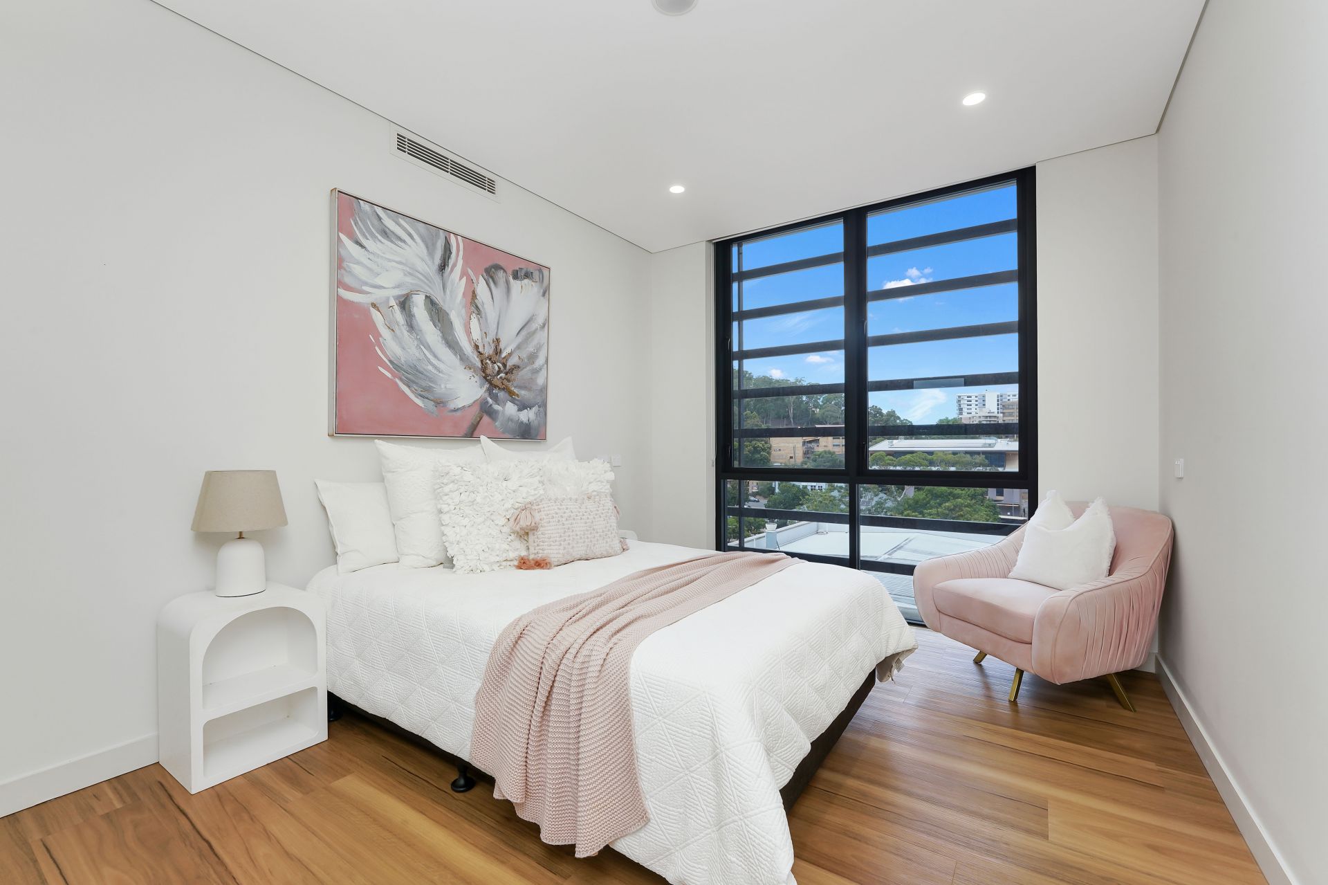 At the heart of the home is the open-plan kitchen, living and dining area, enhanced by floorboards and downlights throughout. The stylish kitchen is well-appointed with stainless steel appliances, an integrated fridge, gas cooktop and eye-catching mirrored splashback, creating a refined yet practical cooking space. This light-filled living zone flows seamlessly out to a private balcony, perfect for relaxing or entertaining while enjoying the elevated outlook.