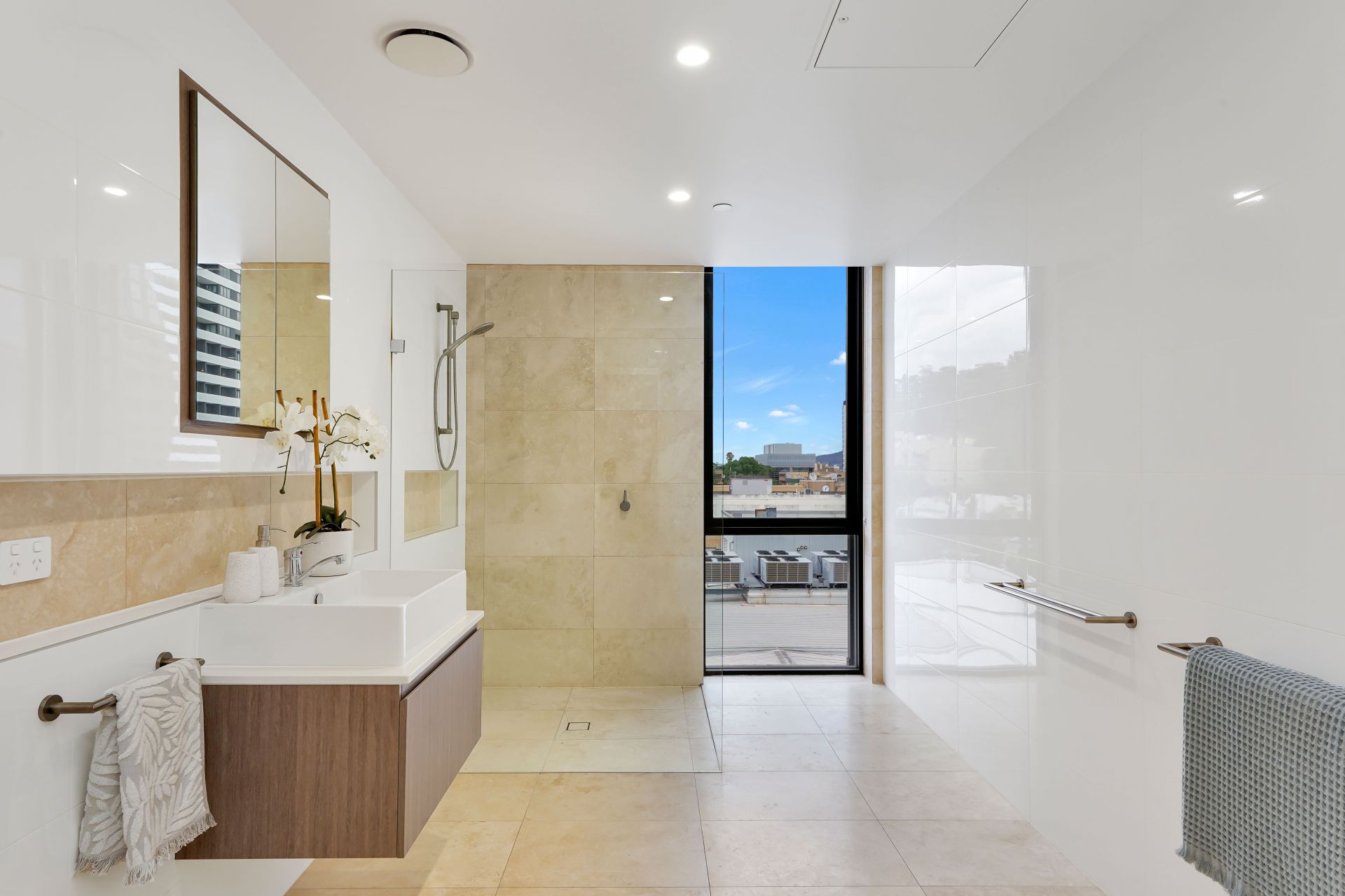 The stunning bathroom is finished to a high standard, featuring contemporary fixtures and a frameless glass shower screen that adds a touch of luxury, as well as limestone flooring. Abundant natural light throughout the apartment further enhances the sense of space and comfort.