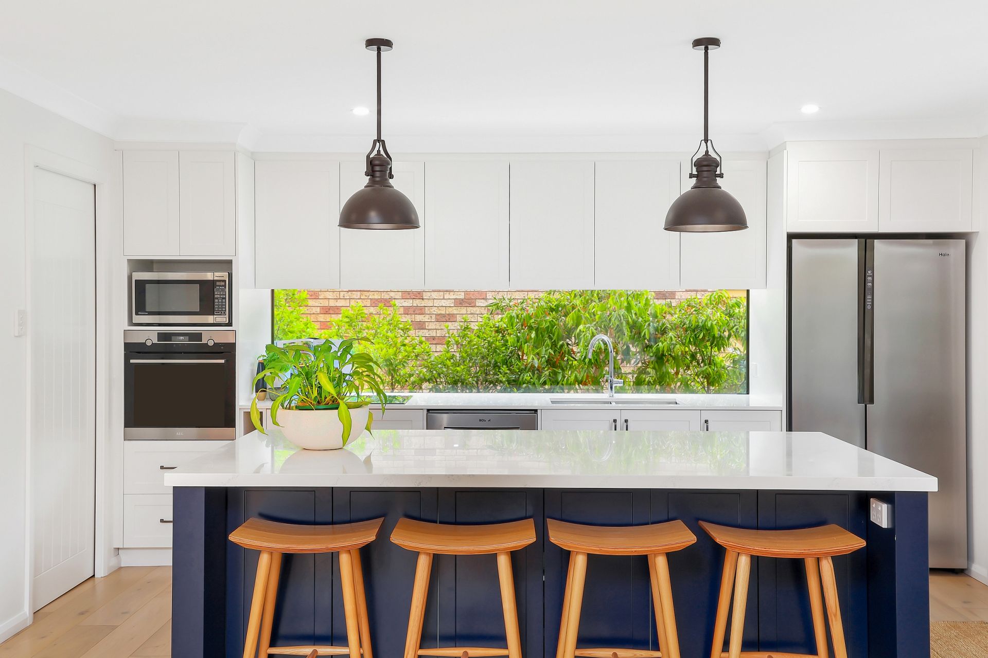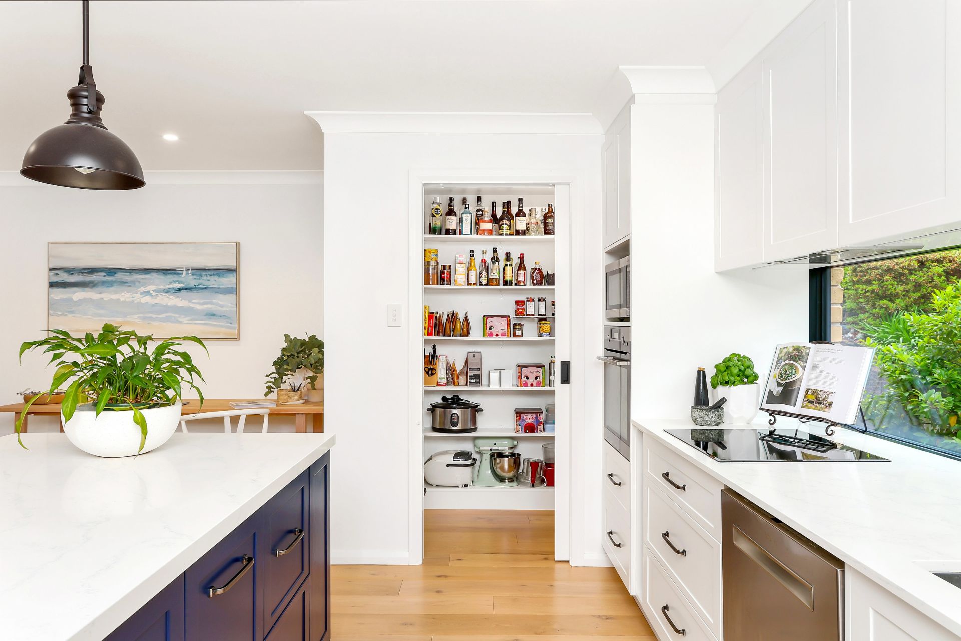 The kitchen is a chef's delight, featuring thick stone benchtops, a beautiful window splashback, and premium AEG appliances, including an induction cooktop and pyrolytic oven. A spacious butler's pantry and soft-close cabinetry adds luxury to this highly functional space.