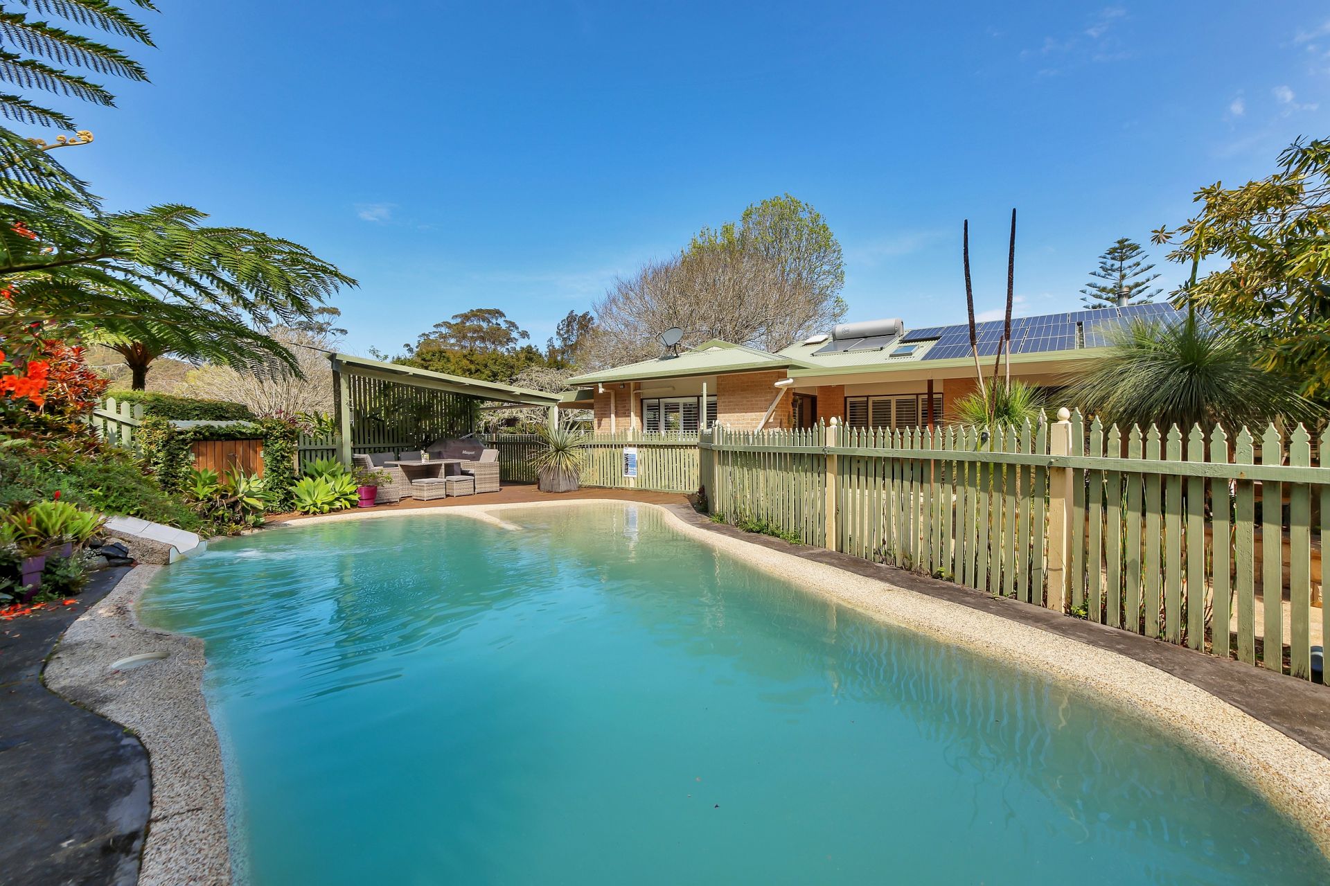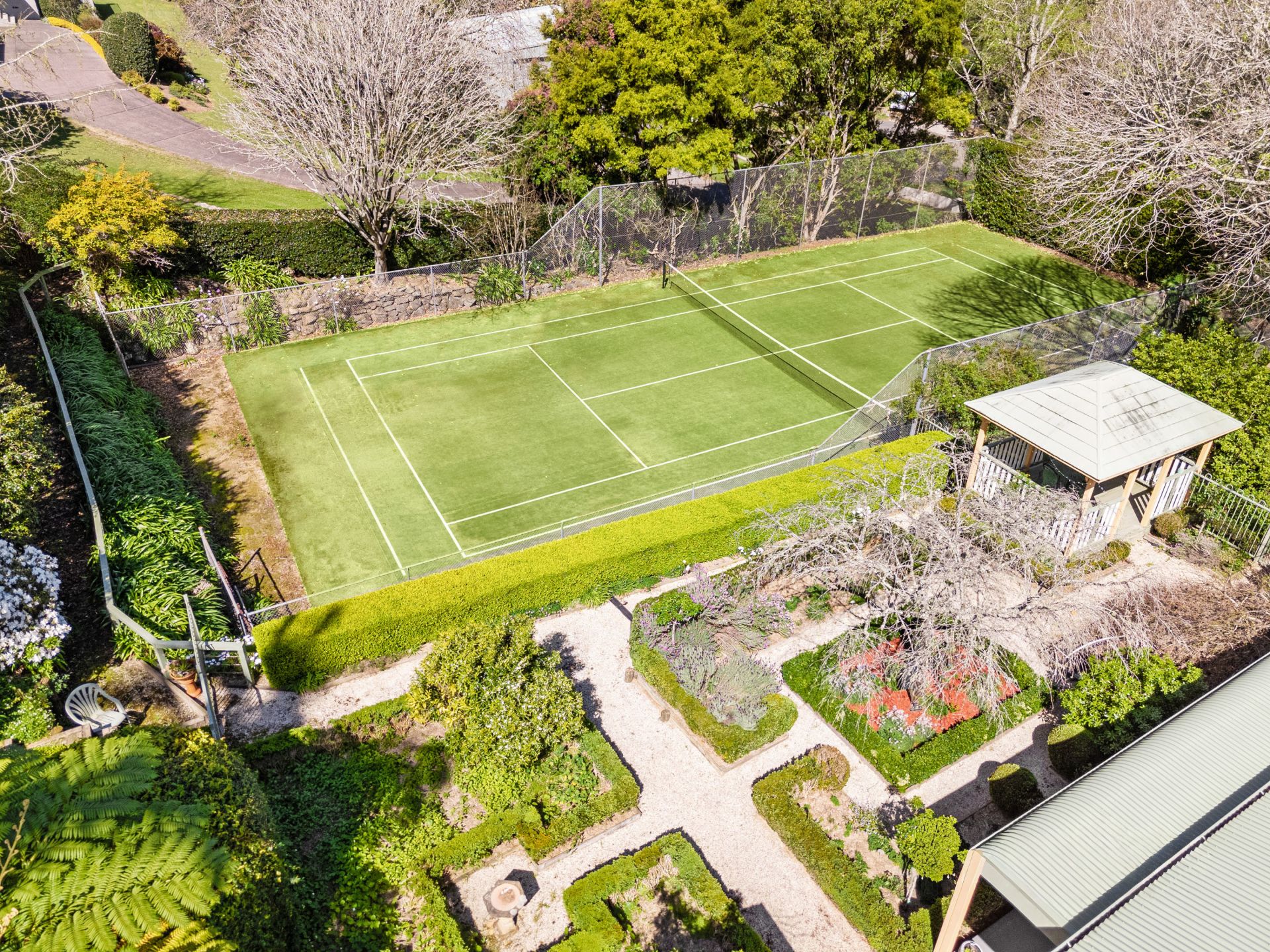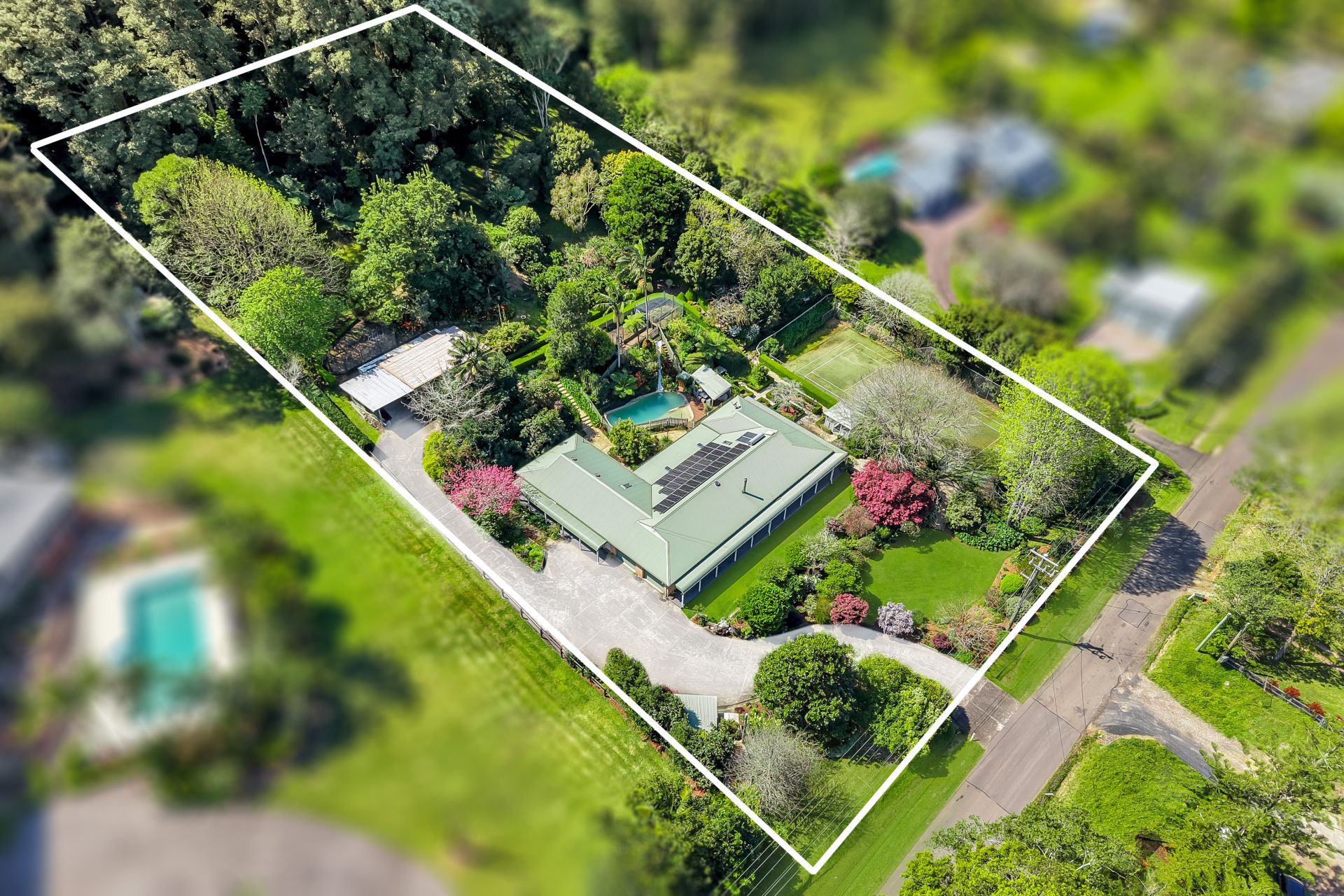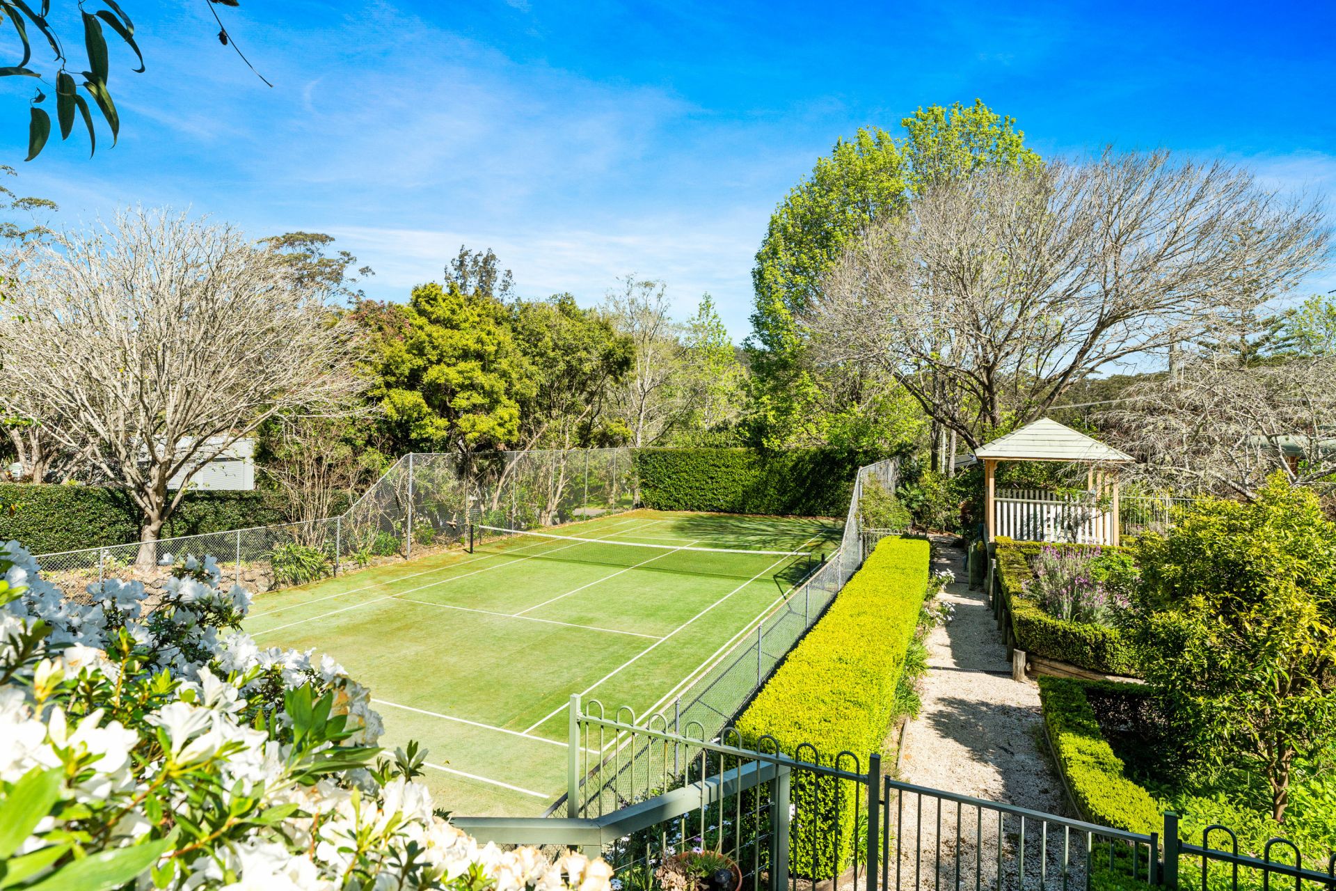 Set on 1.9 acres of beautifully mature landscaped gardens, the home has been recently refreshed, offering a neutral palette, which compliments the light filled interiors. An enviable lifestyle is be enjoyed with multiple formal and informal living spaces throughout with a vibrant floral outlook from every window, a covered alfresco patio to the rear of the home and cabanas overlooking both the lagoon-style swimming pool with slide and the full-size synthetic grass tennis court.