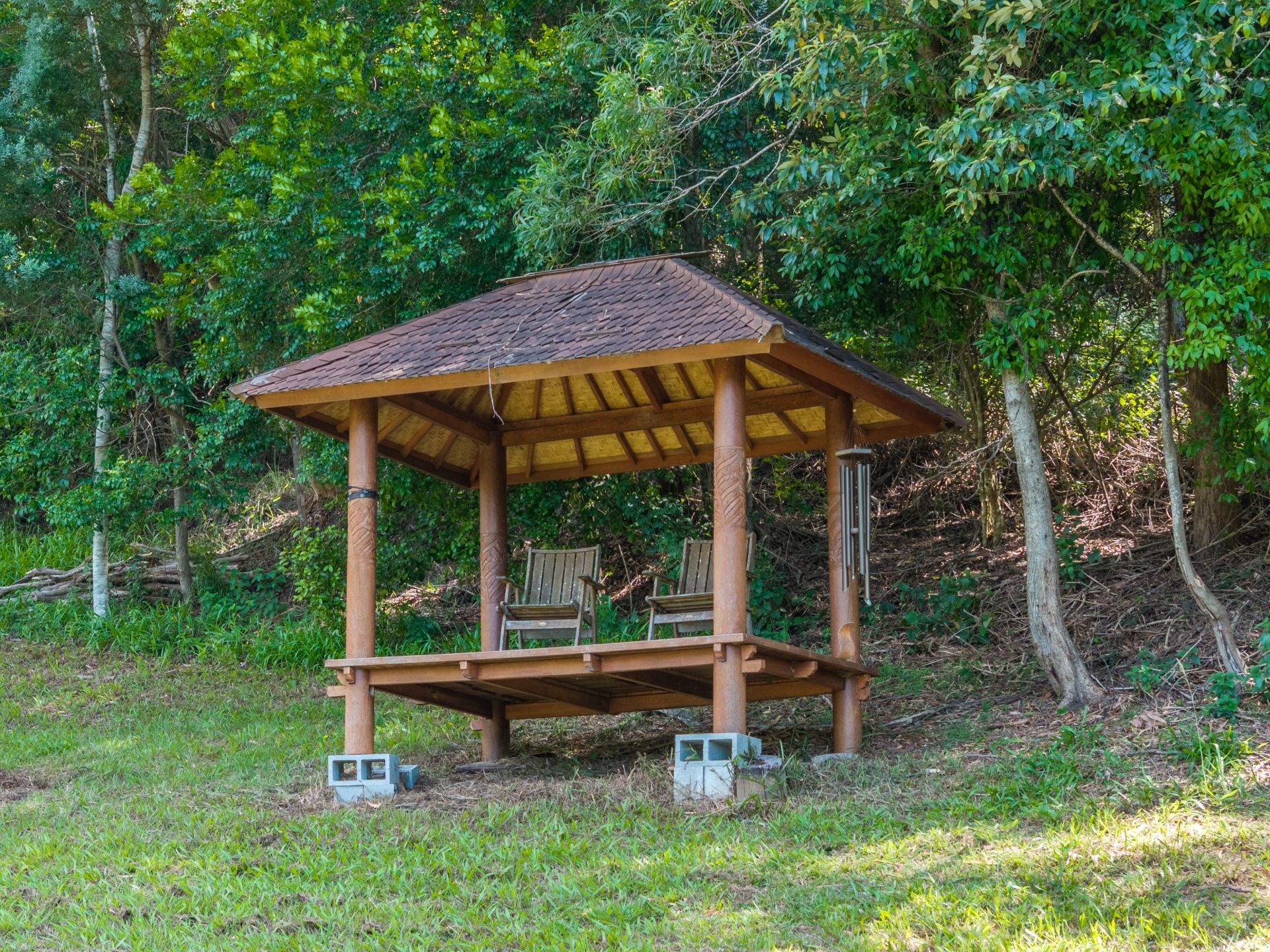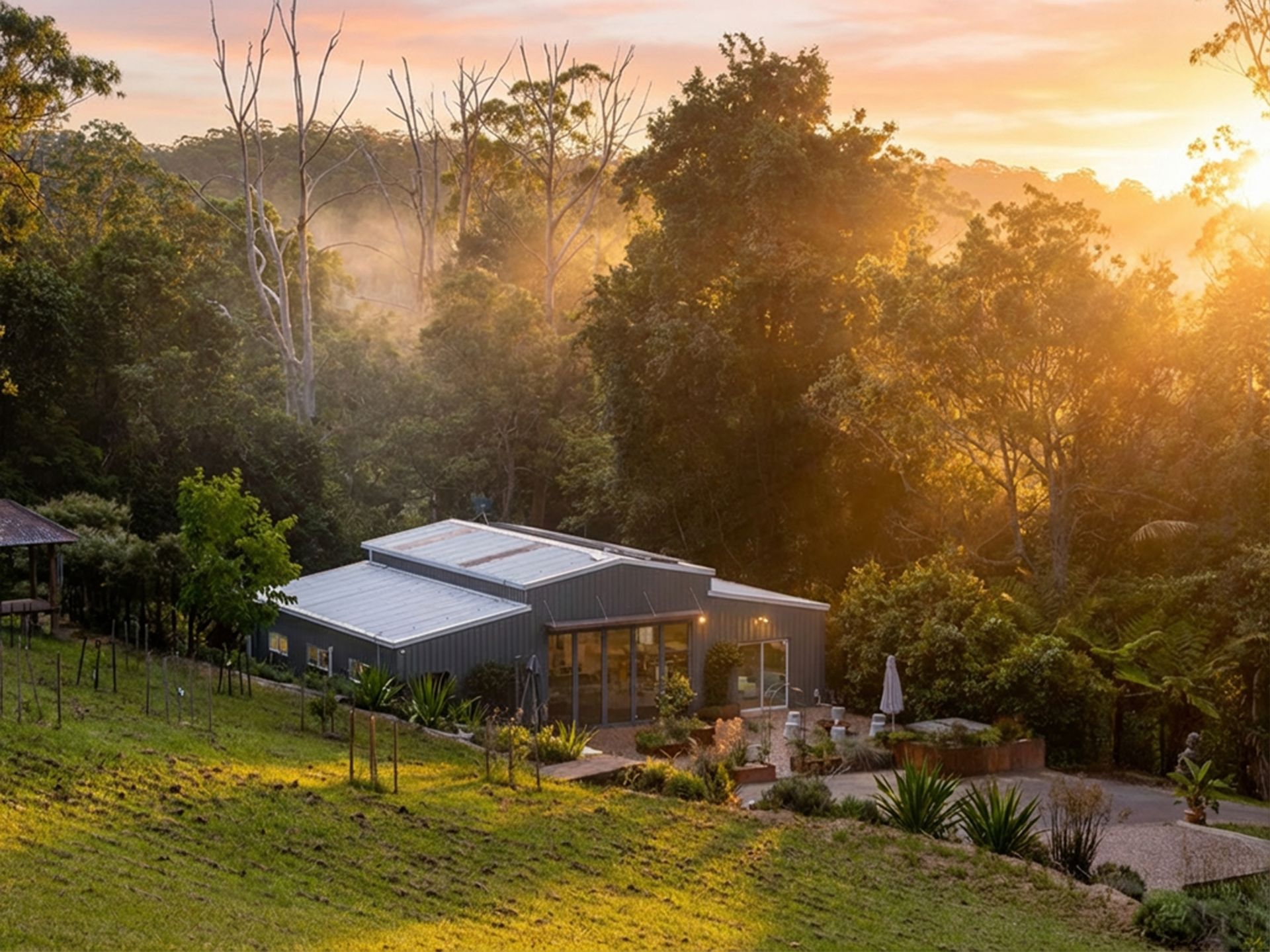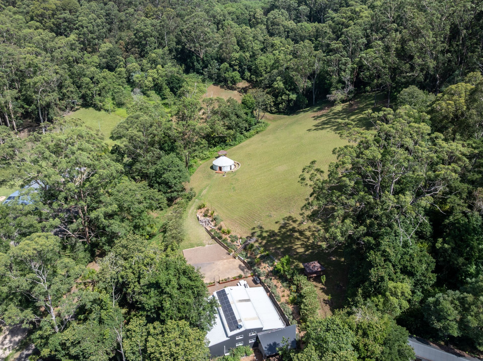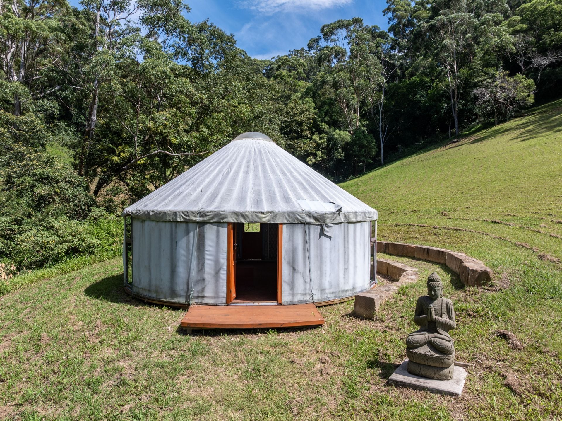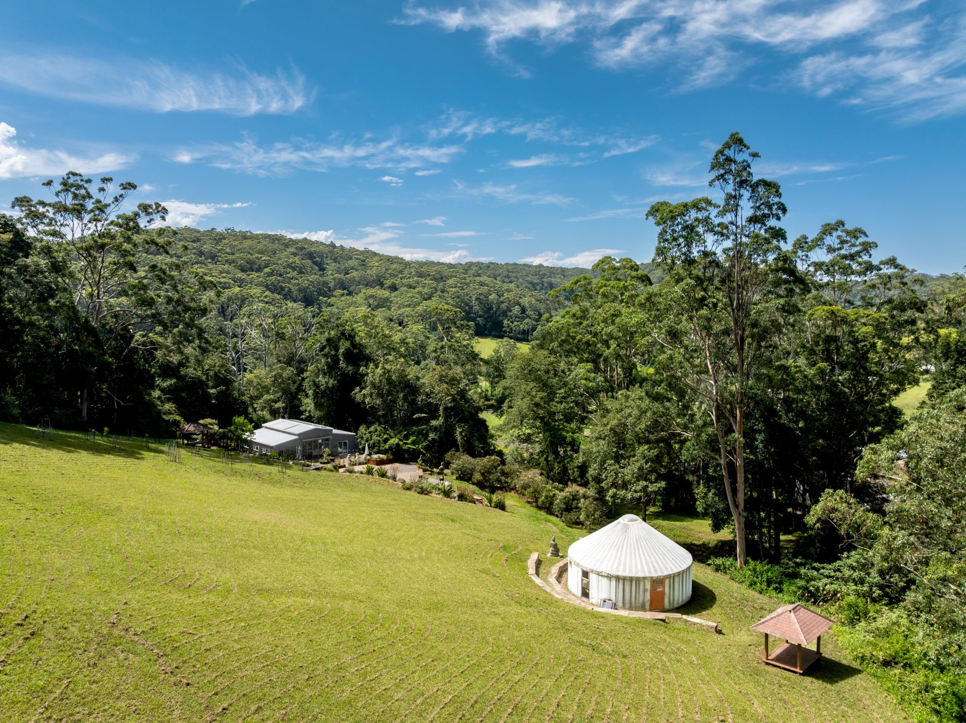 Beyond the sandstone retained gardens is a large, elevated grassed area with citrus & fruit plantings, a permanent Yurt and two Balinese inspired huts offering space to reflect and relax. Future owners will have the opportunity to build an elevated residence, which would provide a scenic outlook and capture sea breezes.