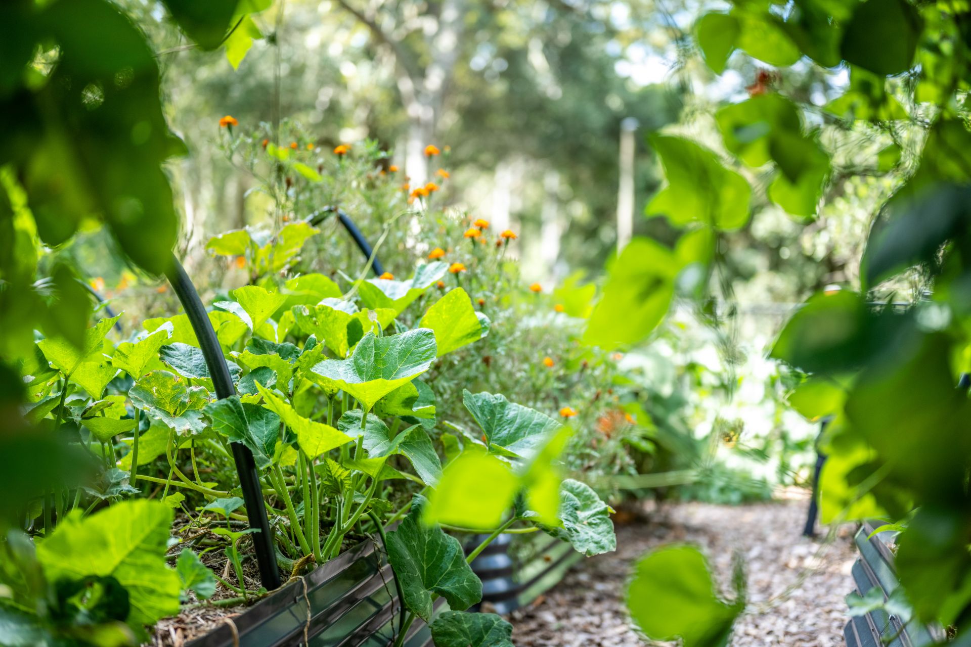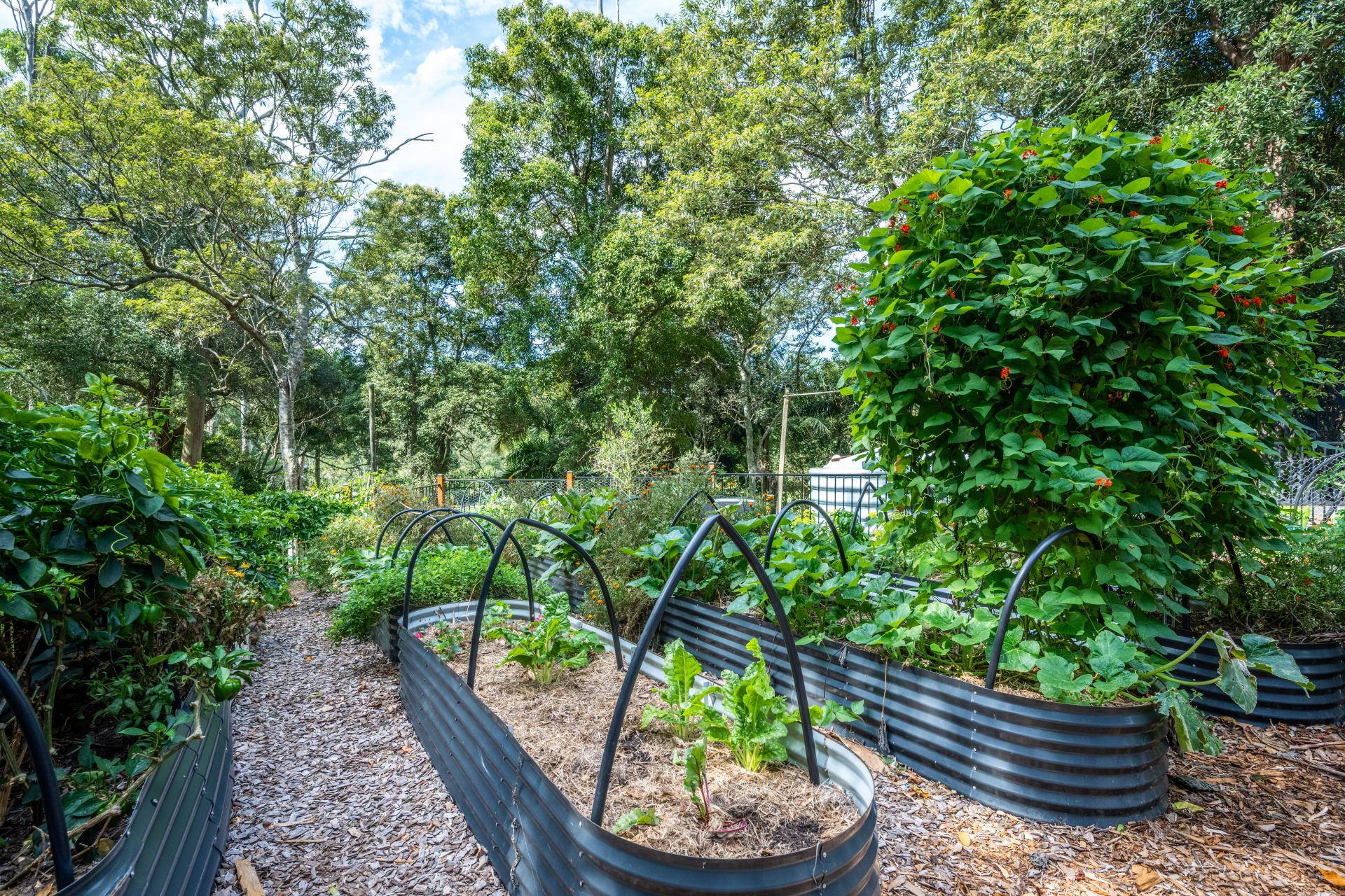 Glass bi-fold doors open out from the living room to a sun filled courtyard and entertaining area with a six-person spa. To the rear of the residence are raised vegetable and herb gardens, thoughtfully companion planted to ensure the best yields.