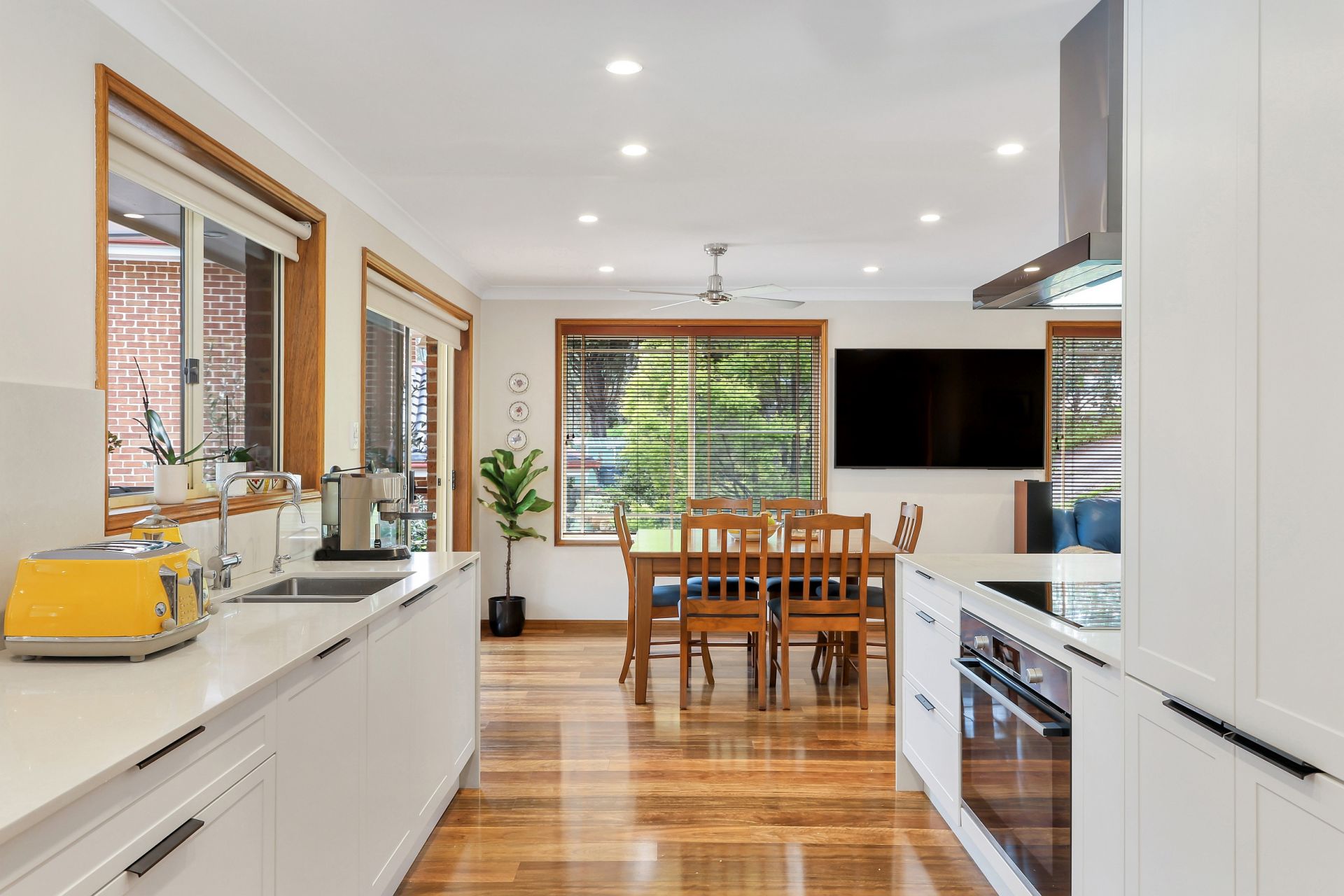 The heart of the home features a high-quality galley-style kitchen, complete with chef-worthy appliances and seamless access to a lovely covered deck-perfect for morning coffees, casual meals, or quiet evenings overlooking the established gardens.